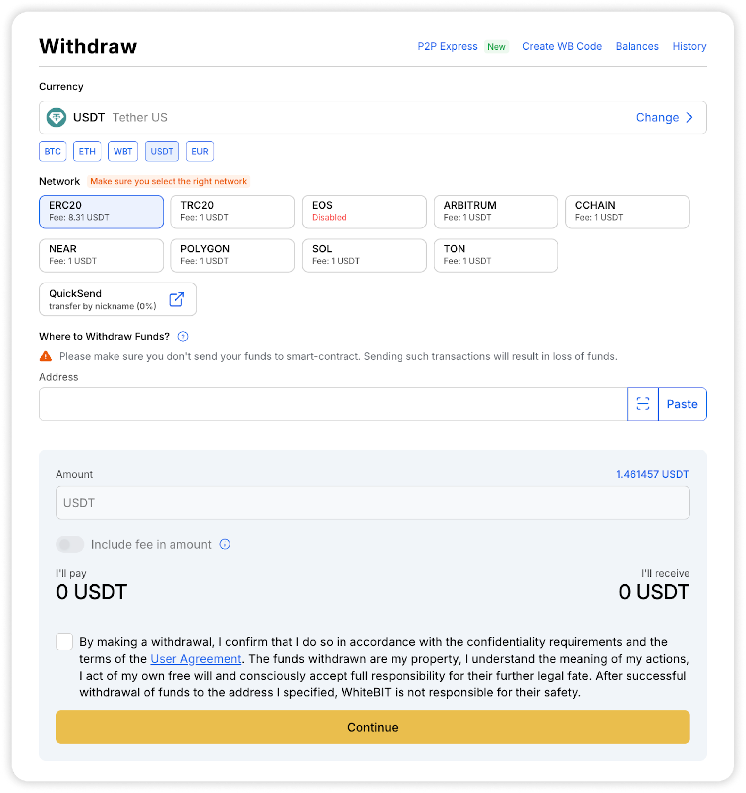 Read the important information at the top of the withdrawal window. Select the network (if necessary), select the fee currency, specify the withdrawal address or scan the QR code of the address on the receiving platform, specify the amount and click "Continue".