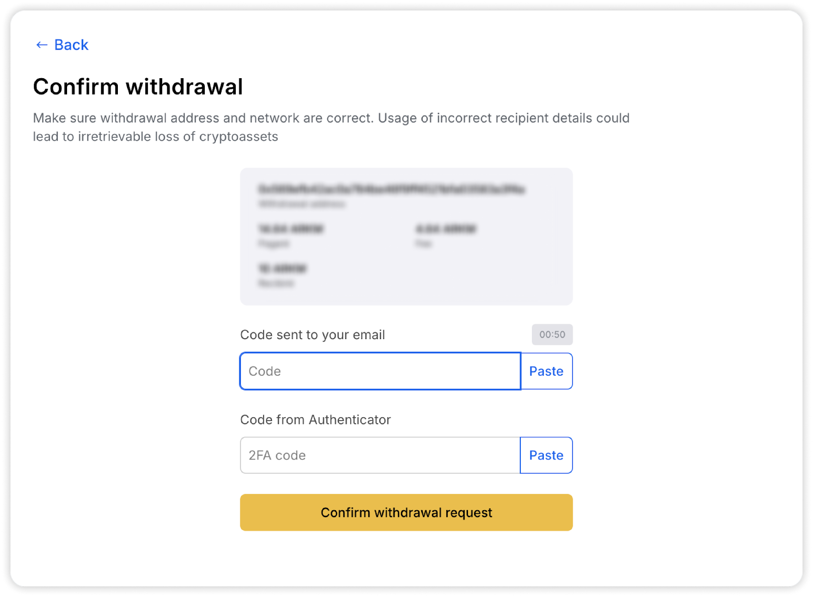 You will need to confirm your withdrawal using the code sent to the email that is linked to your WhiteBIT account, as well as via 2FA (if you have Two-factor authentication or Passkey enabled).