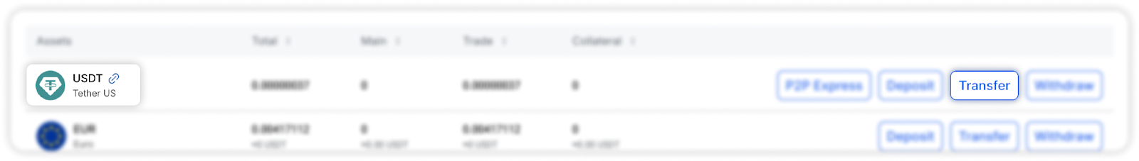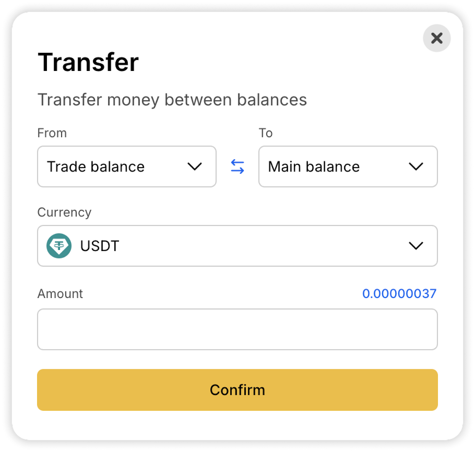 Select the currency you would like to transfer. Then select from the drop-down list the transfer from "Trade" or "Collateral" balances to "Main", specify the amount of assets to be transferred and click "Confirm". Your request will be completed instantly.