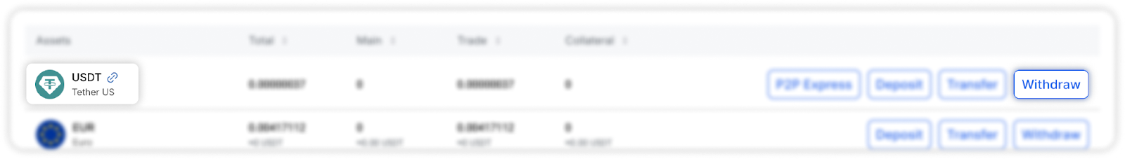 Find the currency by USDT ticker and click on the "Withdraw" button. You can also use the "Withdraw" button in the upper right corner of the balances page and select the desired asset from the drop-down list.