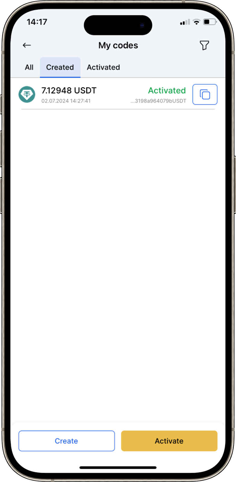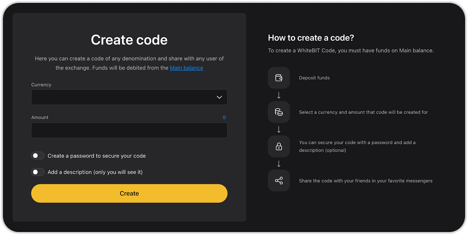 - Go to the “Codes” section on the Home screen and click “Create”. Before doing so, make sure that you have funds on your Main Balance;