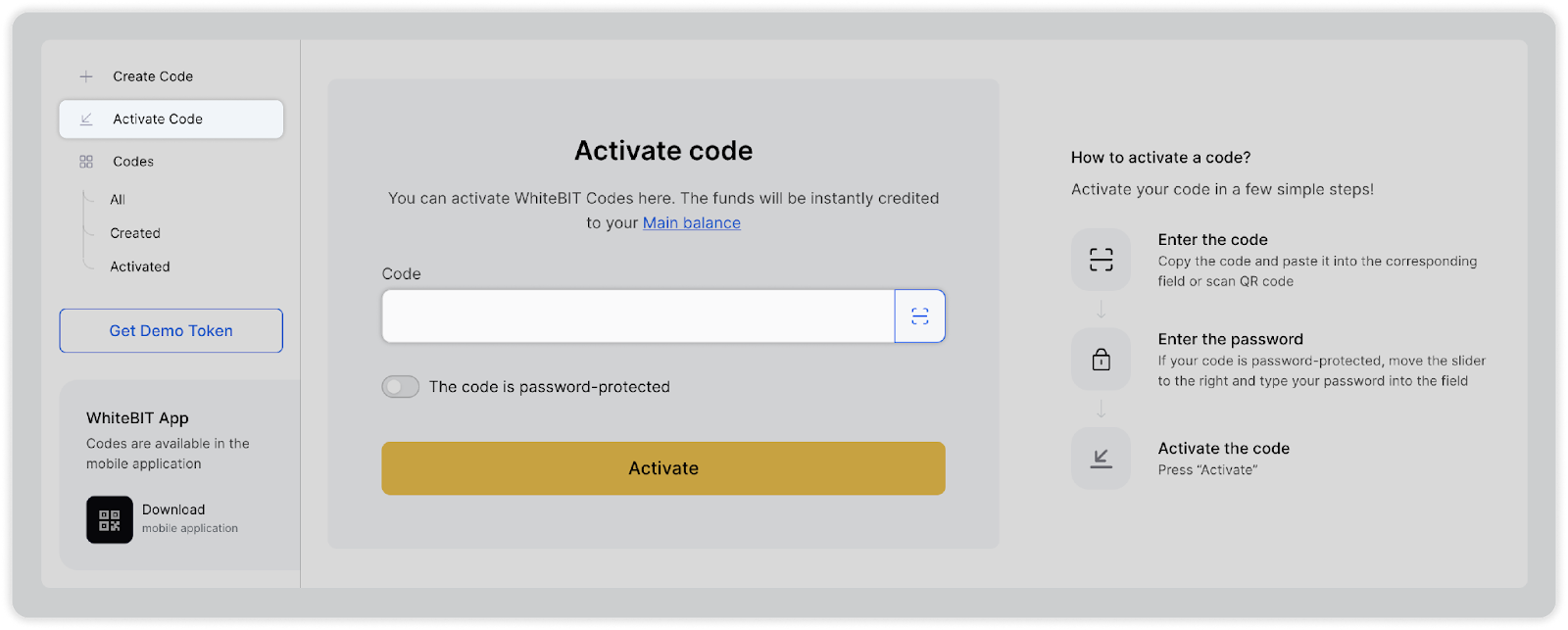 Please note: An activated code cannot be deactivated. Once it is activated, the funds are immediately credited to your balance. However, if a code has only been created but not yet activated, you can activate it yourself at any time if you change your mind. It is also important to note that codes can only be used to transfer funds within the WhiteBIT ecosystem — transfers to other platforms are not possible.