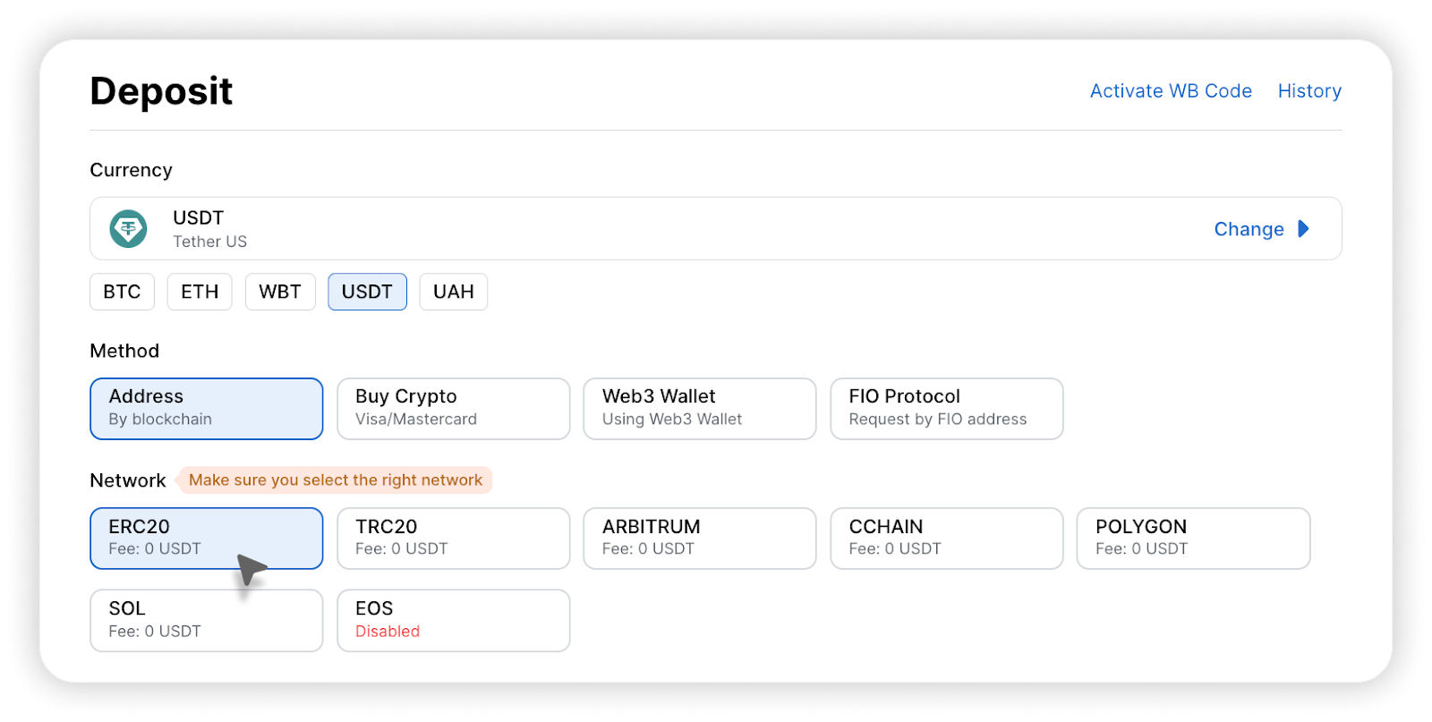 Please note that the sender's network (token standard) that you are going to use for deposits must be the same as the network (token standard) on the WhiteBIT exchange.