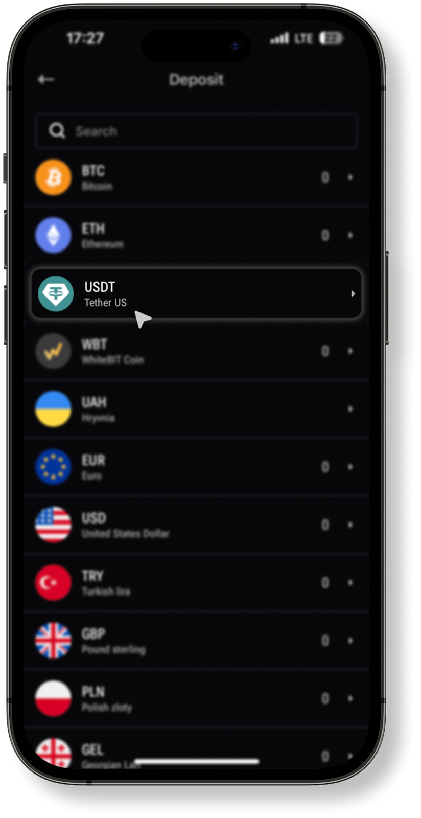 1. When you click on this button, you will see a list of currencies available for deposit. You can use the search function to quickly find the asset you need (for example, USDT).