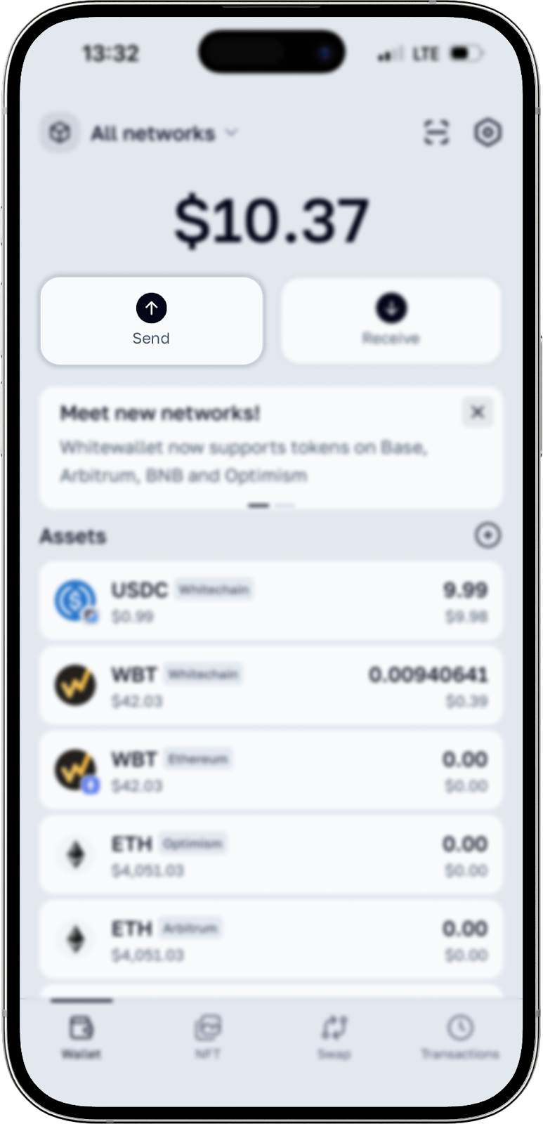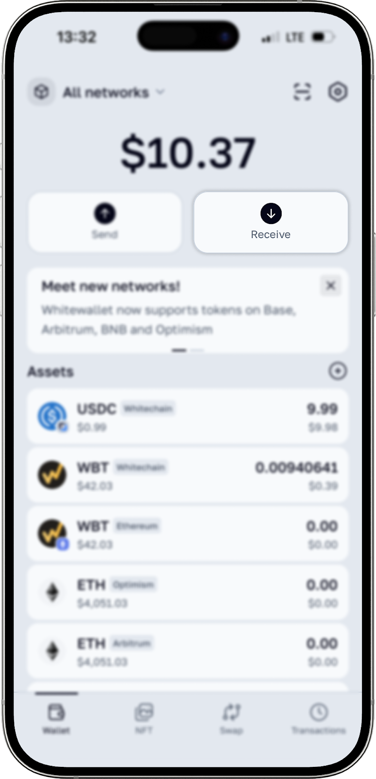 Please note: Whitewallet currently supports the Whitechain, Ethereum, Base, Arbitrum, Optimism, Linea, Solana, Tron, TON and BSC networks.