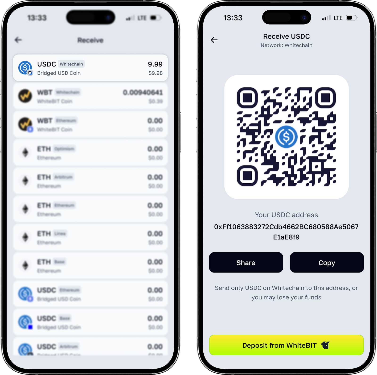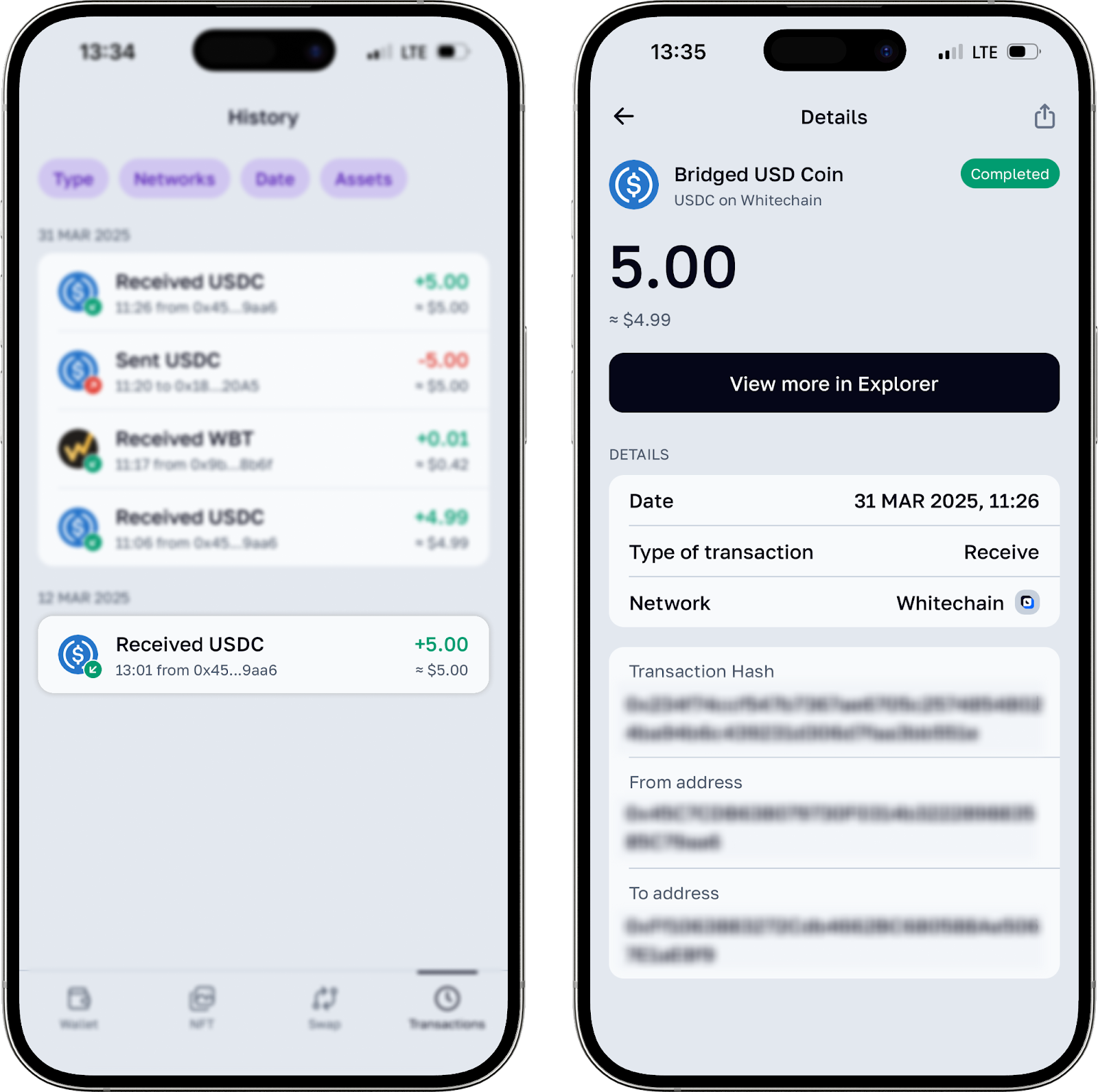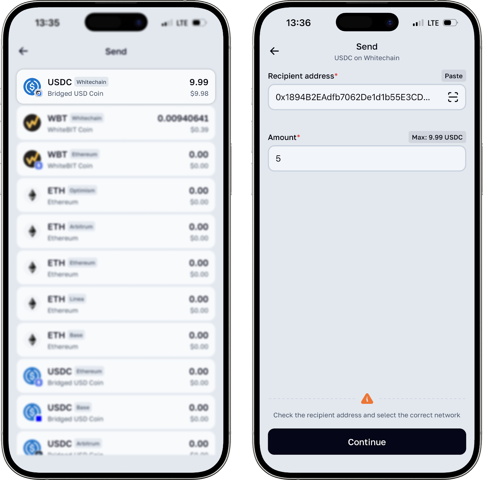 Please note: You can track the status of transactions in the “History” section on the main screen of the app. Withdrawals are currently available on the Whitechain, Ethereum, Base, Arbitrum, Linea, Optimism, and BSC networks.