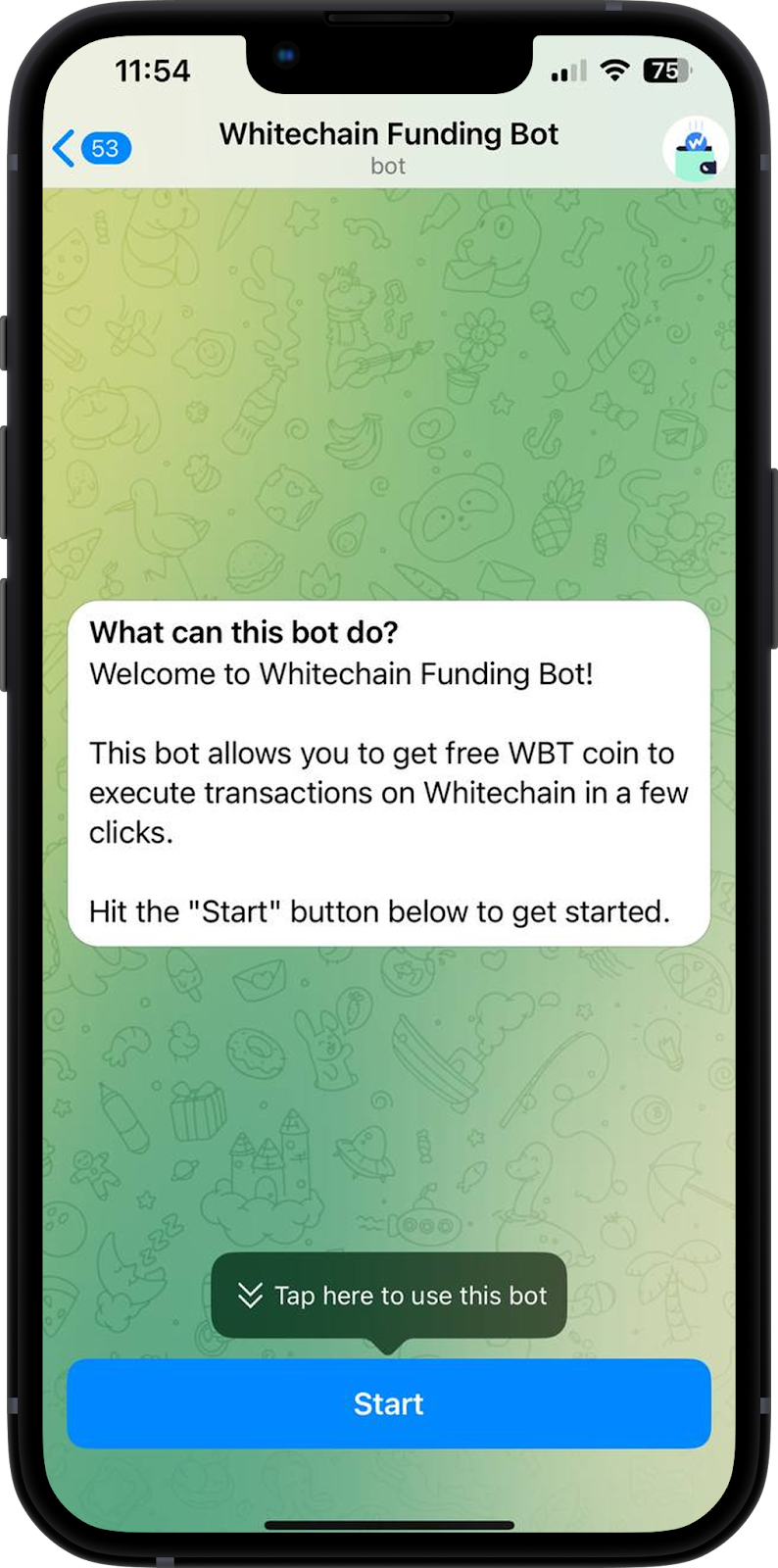 Whitechain Funding Bot is a Telegram bot that allows you to get free WBT to cover the fee for the first 10–12 transactions on the Whitechain network.