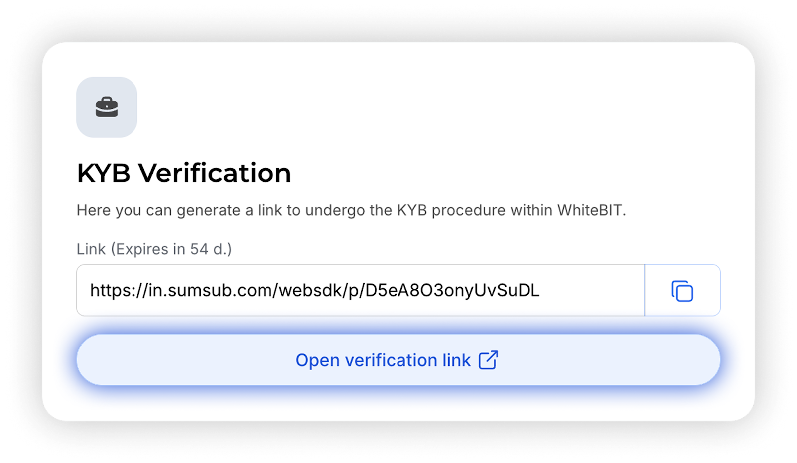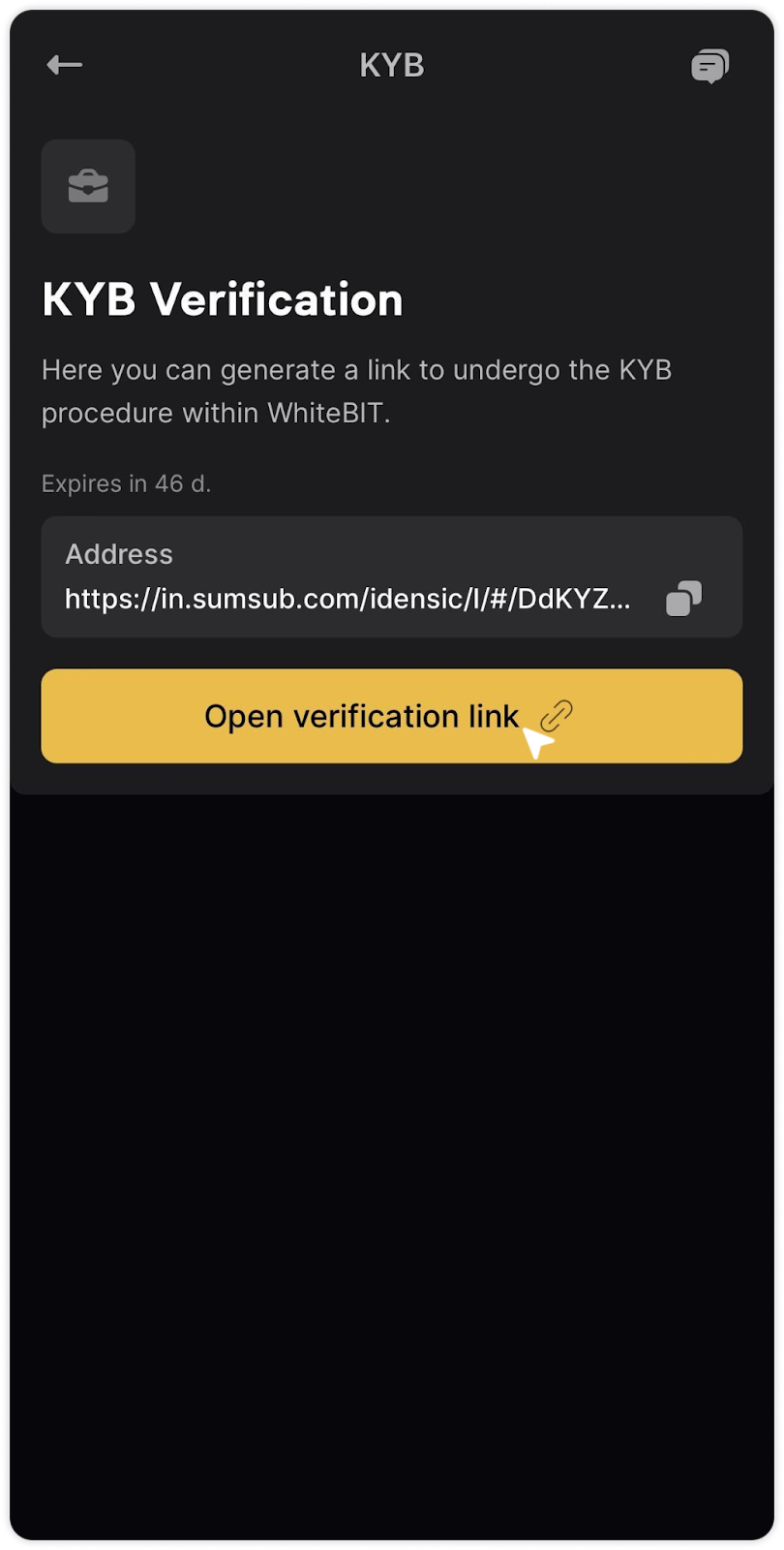 - Click on the “Open verification link” button. You can access the KYB verification form by following the link.