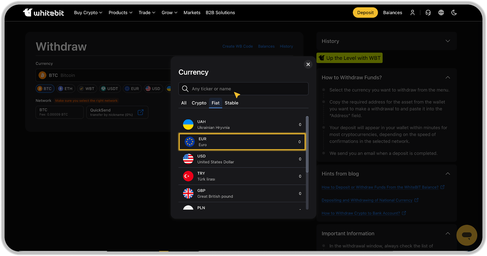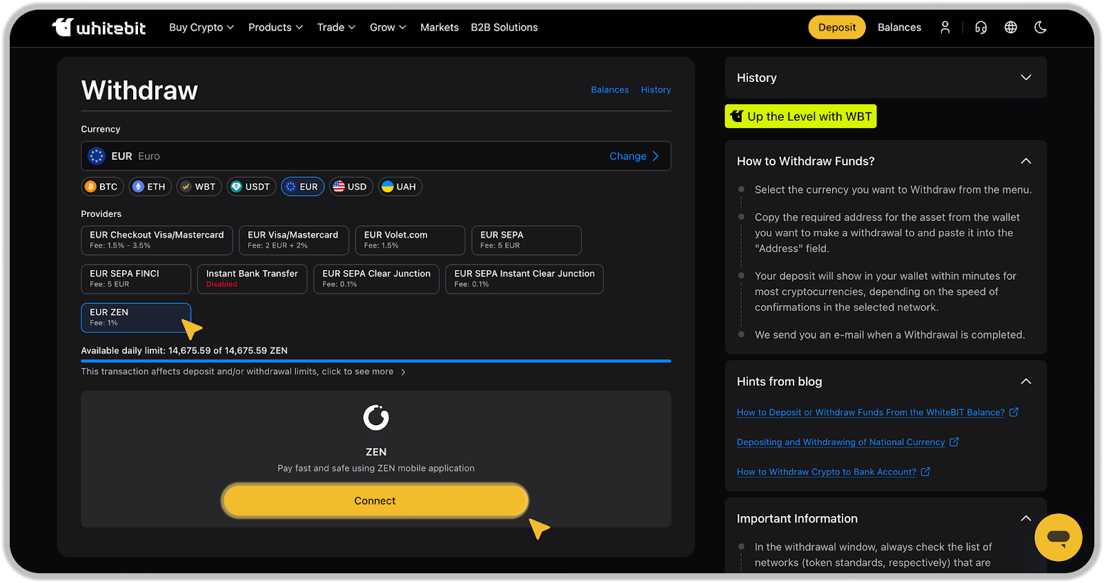 Select ZEN as the method for withdrawing funds in EUR from WhiteBIT. To confirm and create a withdrawal request you need to: