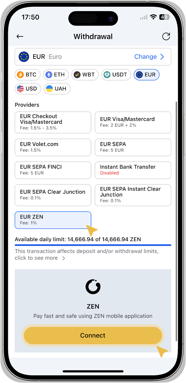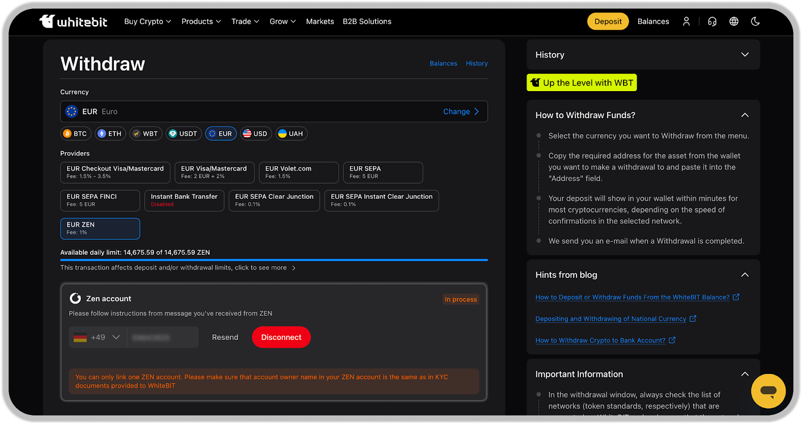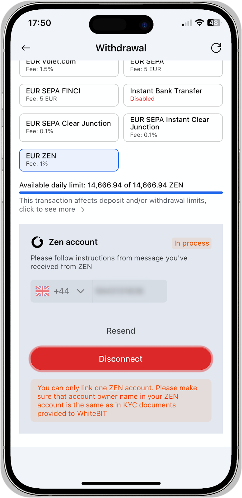 Please note that you can only link one ZEN account. Make sure that the account owner name in your ZEN account is the same as in KYC documents provided to WhiteBIT.