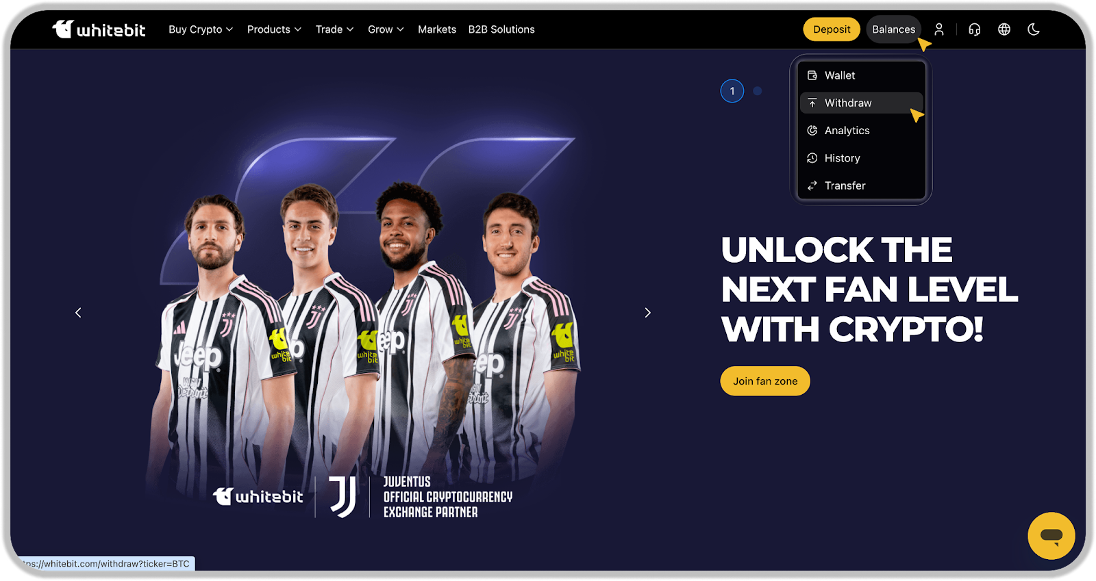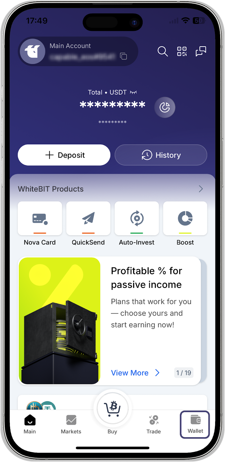 Open the main page of the WhiteBIT application, you can go to the withdrawal form through the "Wallet" tab - "Withdraw".