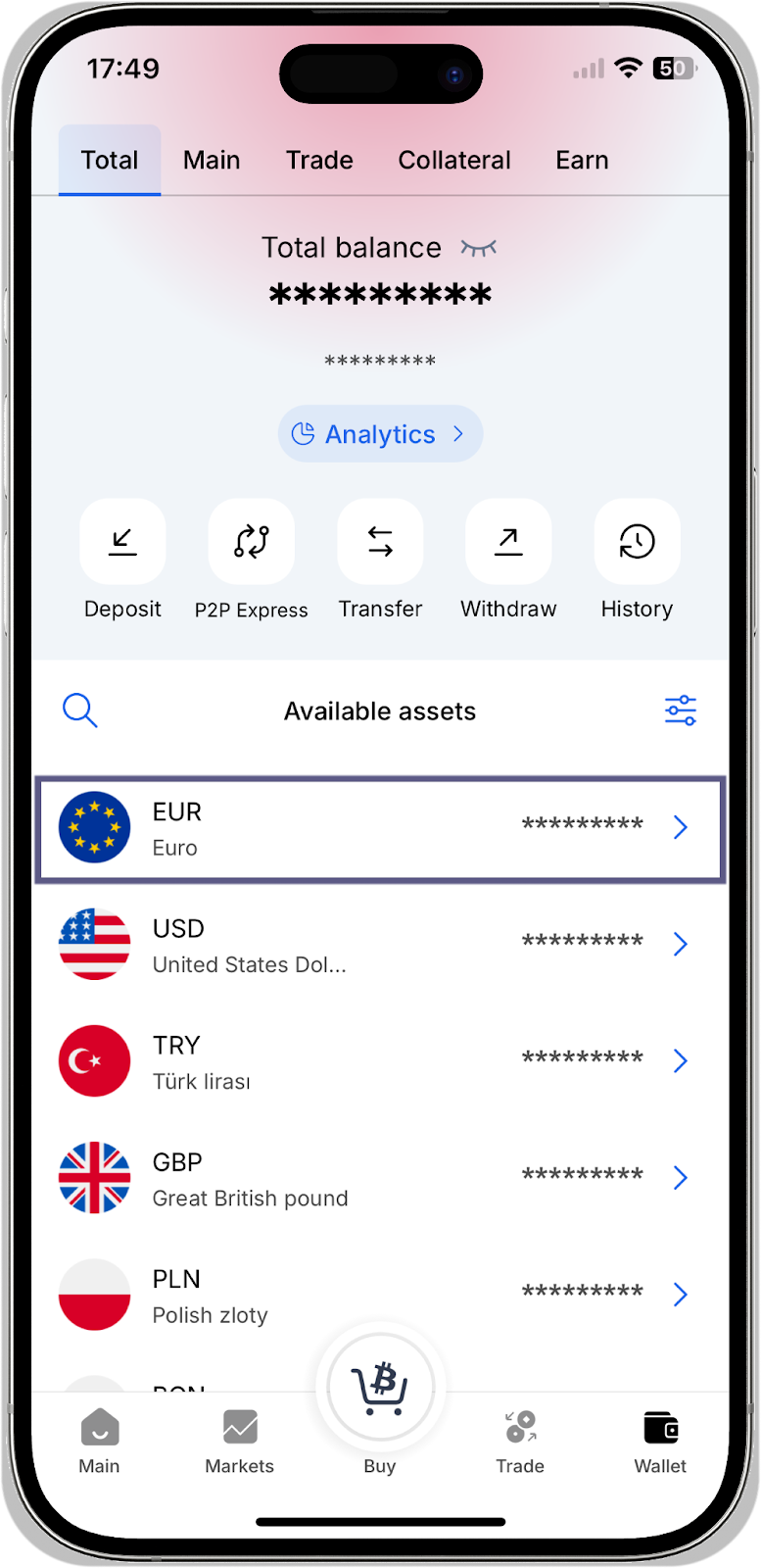 Go to the main page of the exchange and click on the “Balances - Wallet” — “Total”/“Main” button.