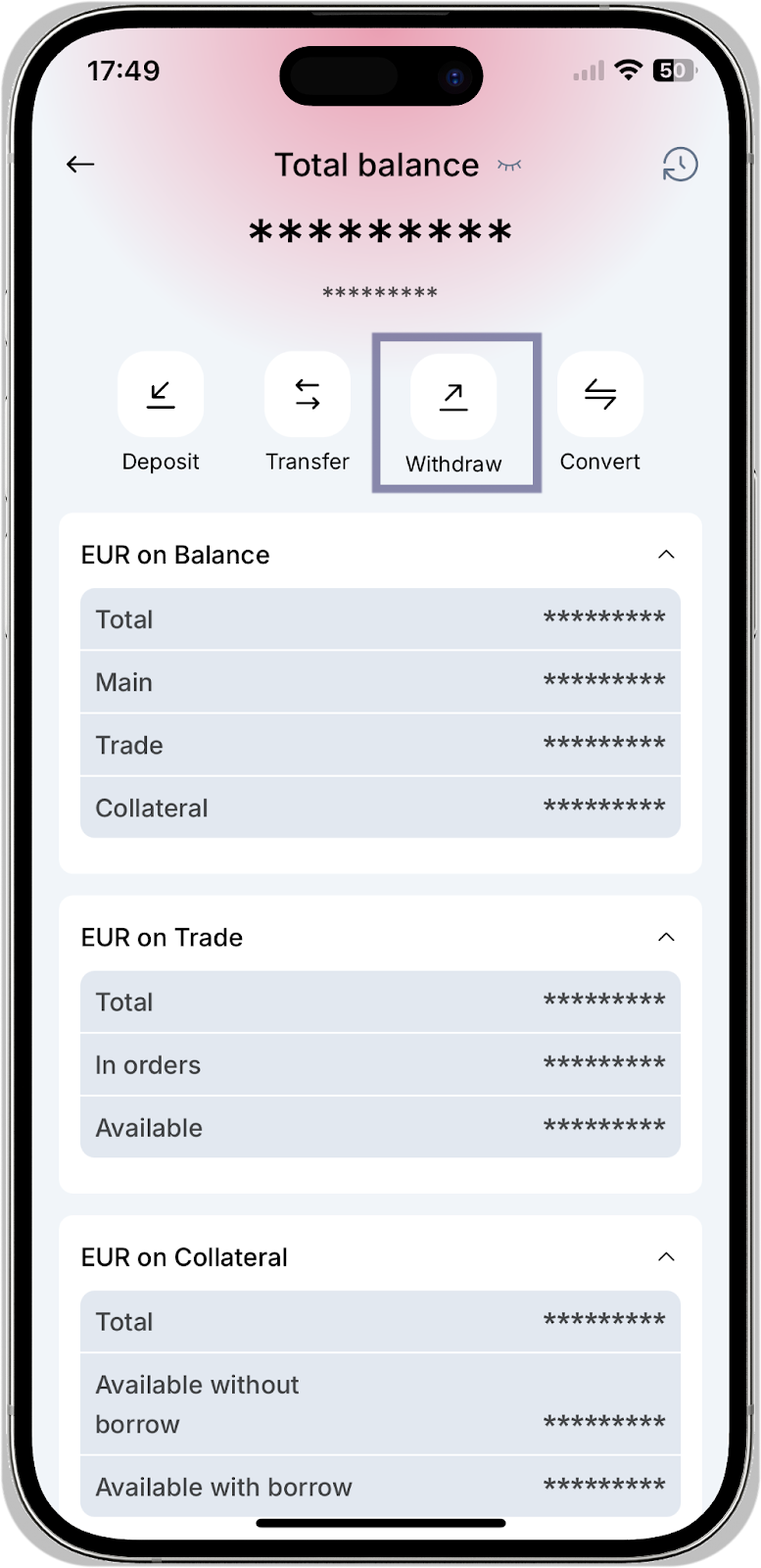 Press “Withdraw” in the line opposite the Euro currency ticker (EUR).