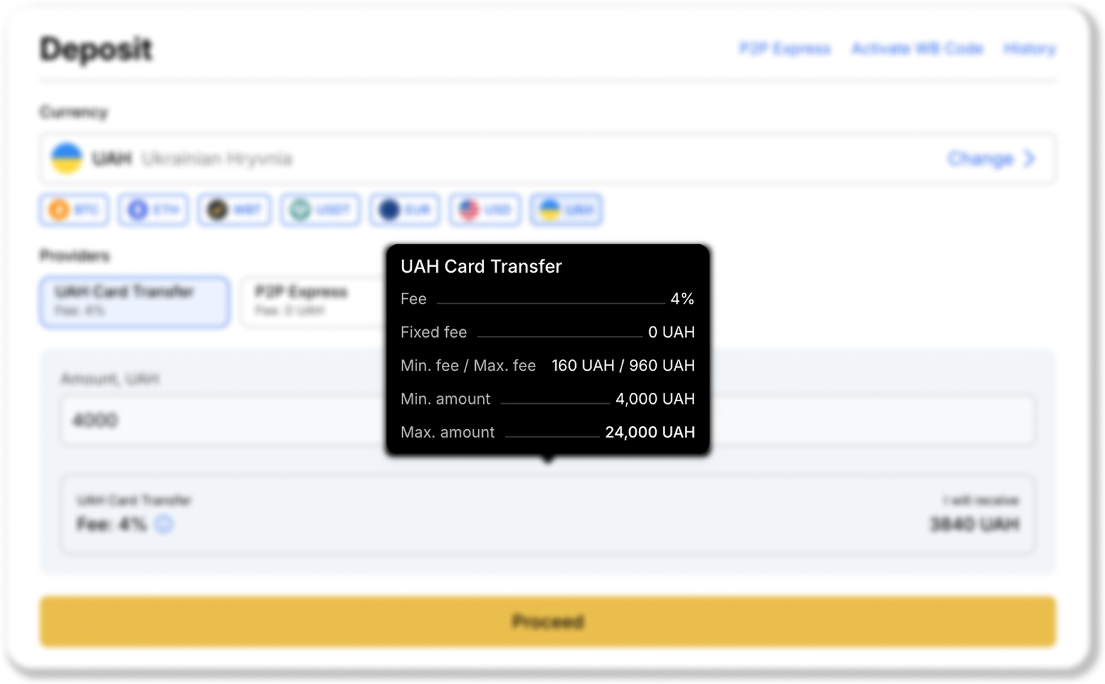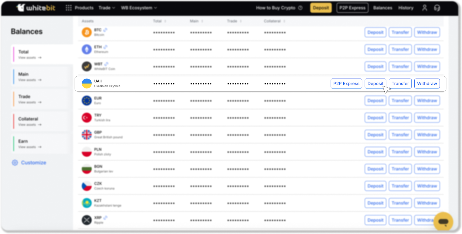 - Find UAH in the list or enter the currency ticker in the search bar. Then click on the "Deposit" button to the right of the selected currency ticker;