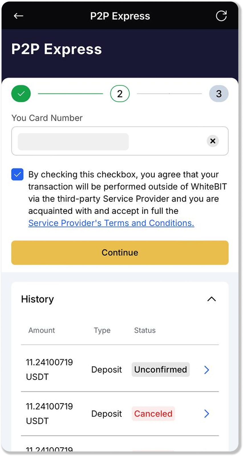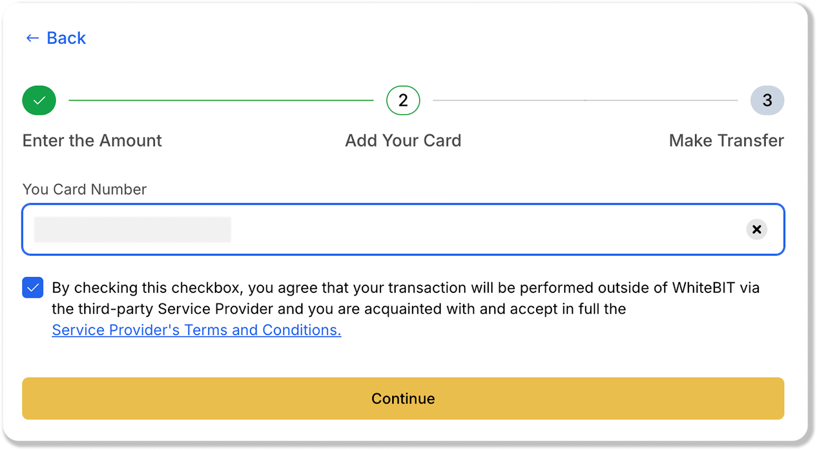 Please note that you should read the service provider's Terms of Use and tick the checkbox that you agree that the transaction will be executed outside the WhiteBIT Exchange by a third party service provider, and confirm that you have read and fully accept the service provider's Terms of Use.