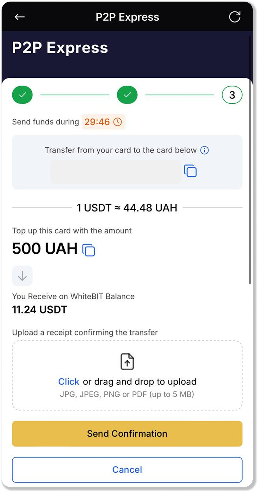 When exchanging UAH to USDT via P2P Express, you will need to transfer UAH to the card number indicated by the provider, after that USDT will be credited to your balance.