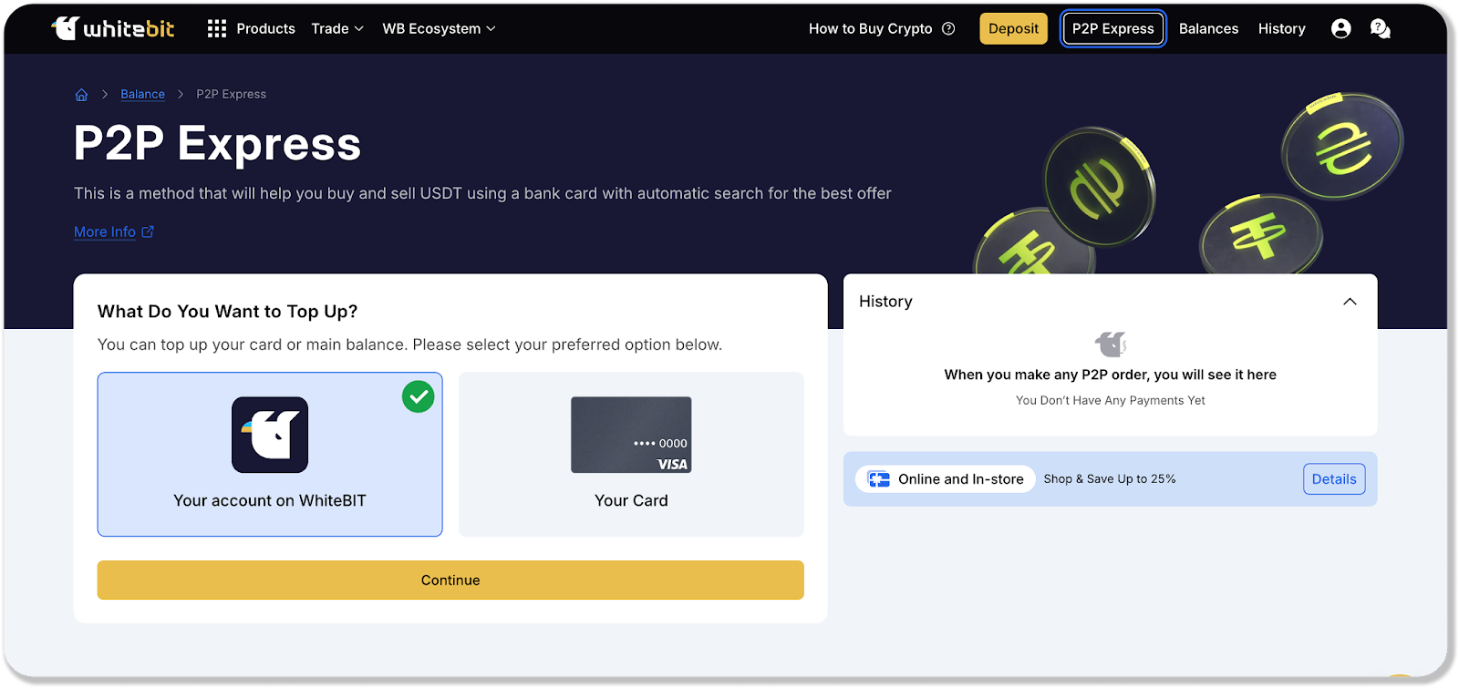 2. Exchange creation. After pressing the "P2P Express" button, a menu with a form will open. In this form, select the “Your account on WhiteBIT” option to exchange UAH to USDT and click “Continue”.