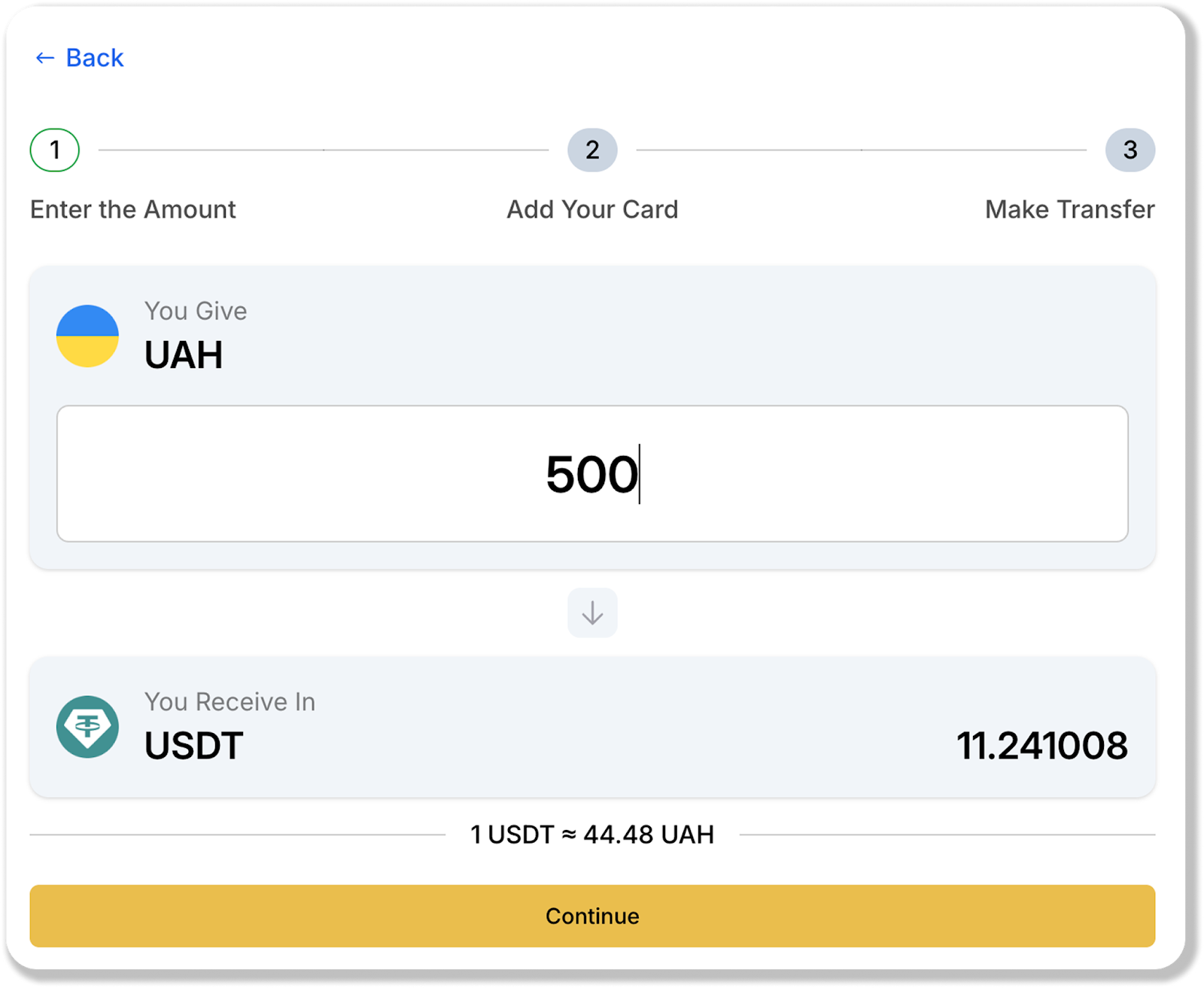 3. Exchange creation.In the next window, enter the desired exchange amount and click "Continue." Here, you will also be able to see how much USDT will be credited to your WhiteBIT balance after the exchange is successfully processed.