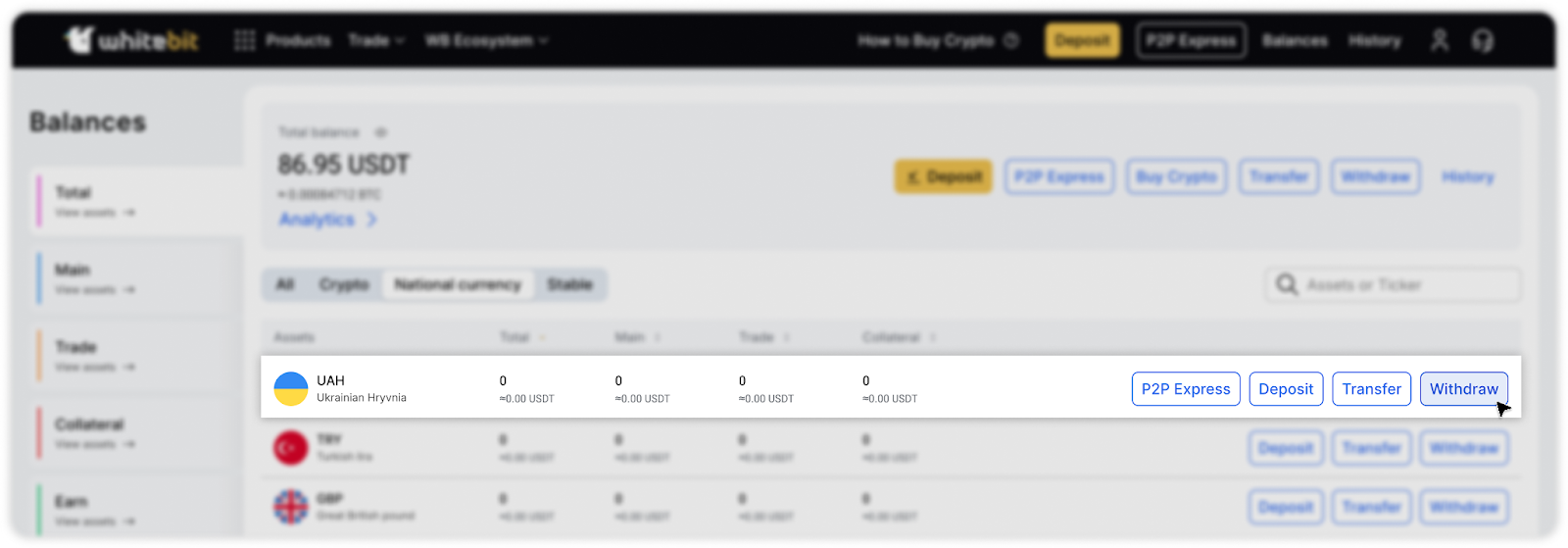 Find the hryvnia in the list or enter the UAH ticker in the search bar. Click on the "Withdraw" button to the right of the currency ticker.