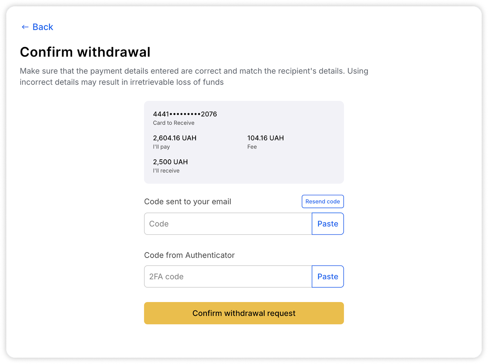 Please note that to confirm the withdrawal of funds, you must enter the verification code that will be sent to your email. This code will be valid for 180 seconds. If two-factor authentication (2FA) is enabled on your account, you will also need to enter the 2FA code from your authenticator app.