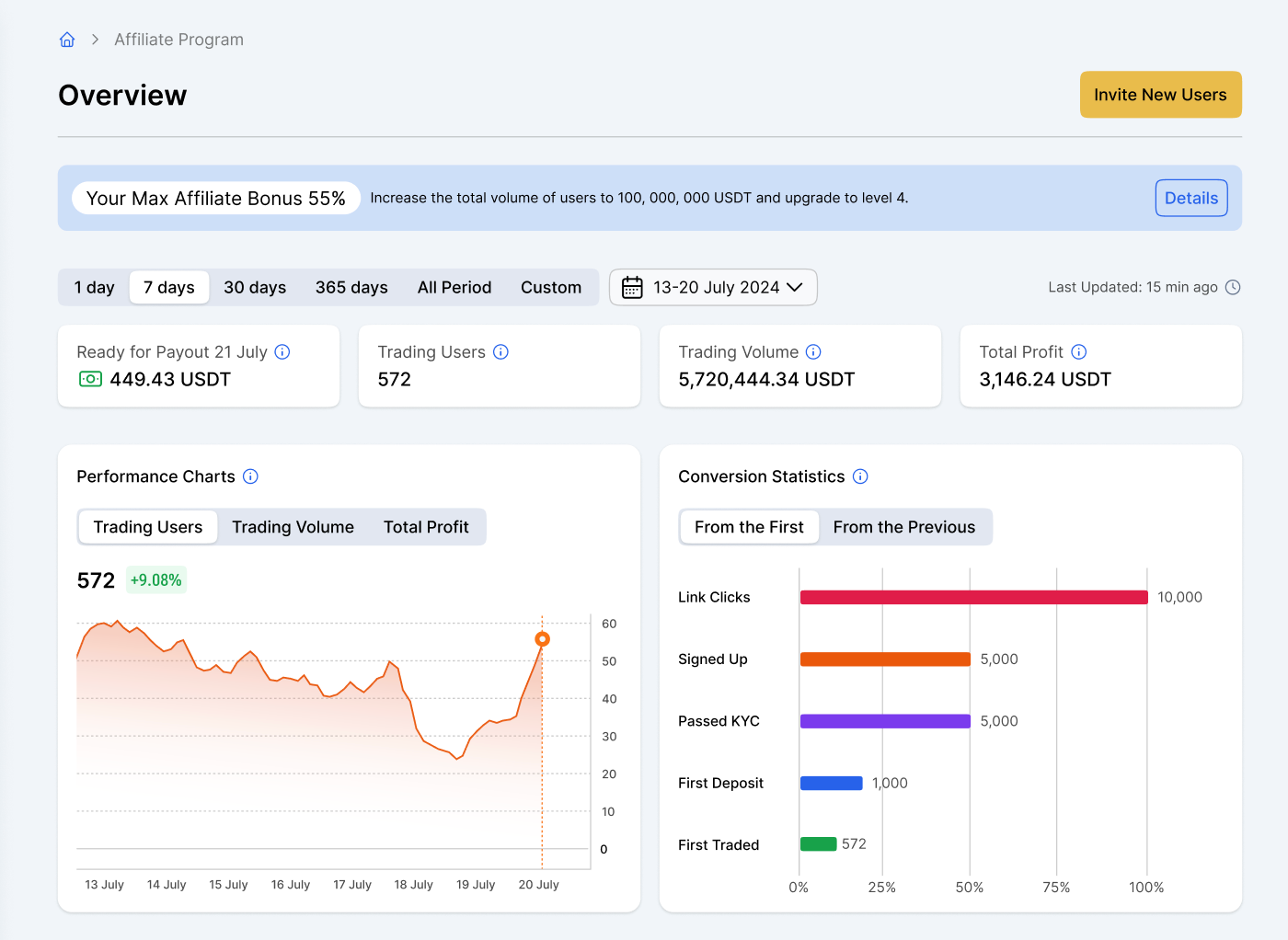 The “Trading Users“, “Trading Volume“, and “Total Profit“ metrics give you an immediate overview of your referral performance. In the “Performance Charts“, you can visually monitor the trends in your trading users, trading volume, and total profit over various periods.