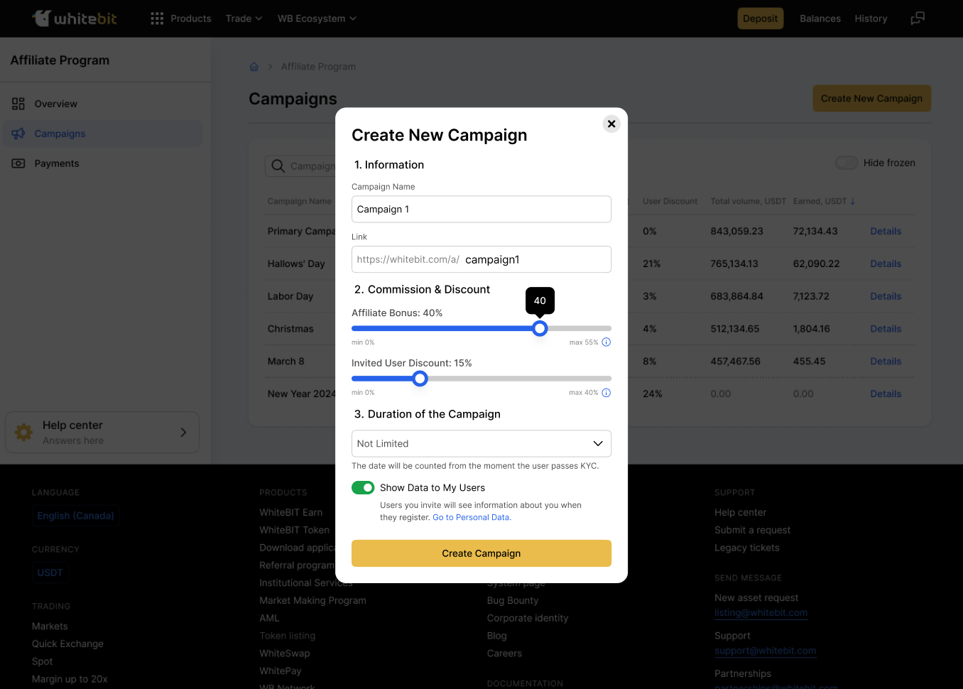- Duration of the Campaign: You can set the campaign's duration, with options ranging from a limited time to no limit at all. The campaign’s start date is automatically set when the invited user passes KYC (Know Your Customer) verification.