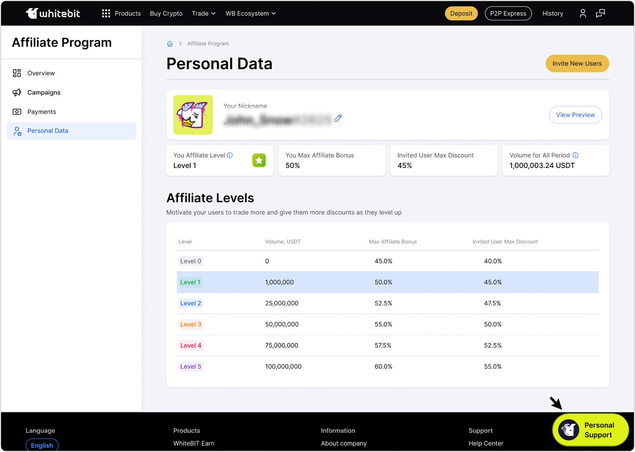 To access the affiliate-level system, navigate to the “Personal Data” section within the Affiliate Program panel. Here, you'll find a detailed overview of your current affiliate level, the maximum affiliate bonus you can earn, and the maximum discount available for your invited users.