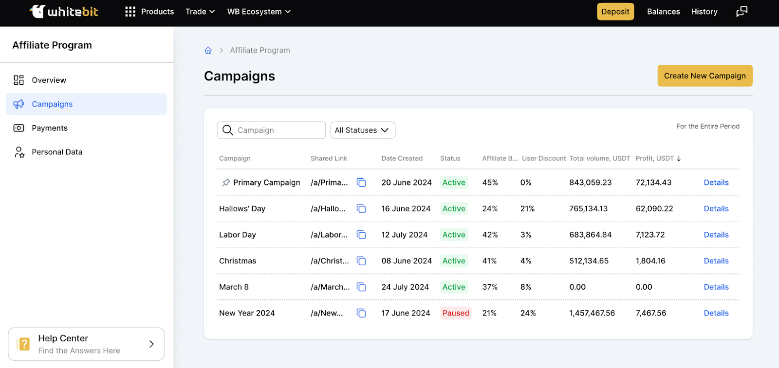 As a WhiteBIT crypto affiliate program participant, you must have a verified account on our exchange and a relevant audience to promote our exchange services. Once you submit your application, our team will assess it based on your social media following and the size of your audience. Upon approval, you’ll have full access to the affiliate panel, enabling you to create and manage campaigns.
