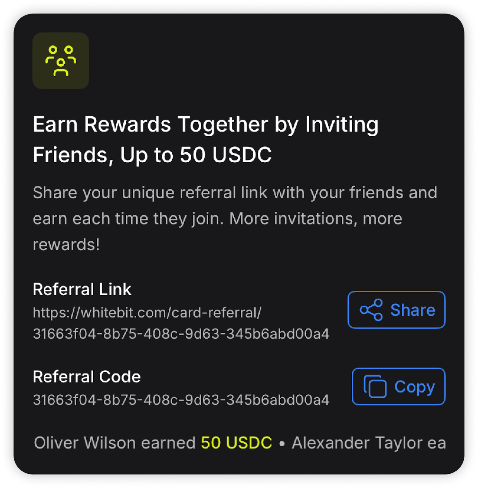 Moreover, each person who applies for a WhiteBIT Nova card via the link from an existing card holder within the Invite Friends program will also receive a 1 USDC bonus. Information about the names of friends who applied for a card using your referral link will also be displayed in the total card balance tab at the bottom of the referral program section.