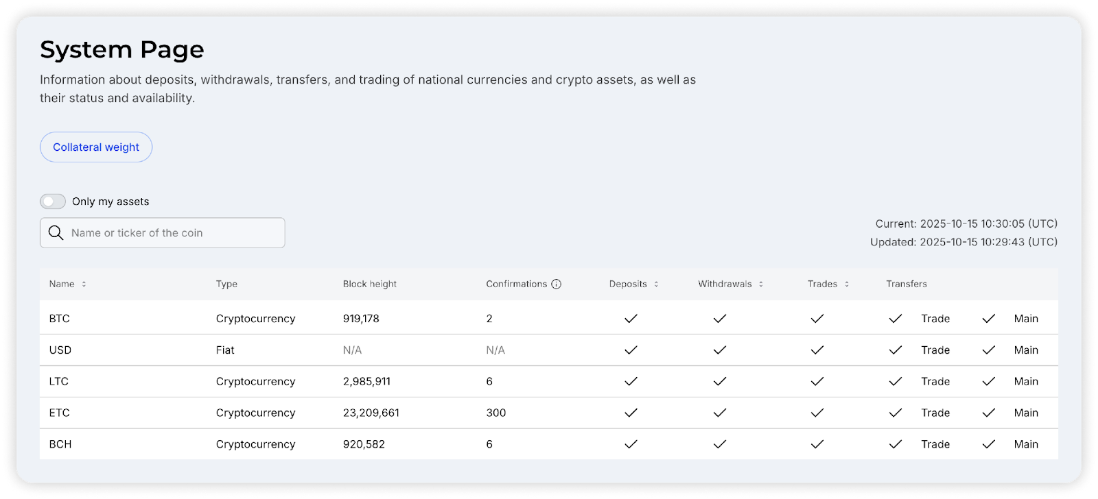 Main part of the page is occupied by detailed information about the currencies available on the platform. Their names, types, block height and network confirmation are specified. The current status of operations, including deposits, withdrawals, trades and transfers, is also displayed. This section is convenient for monitoring the availability of services for each asset.
