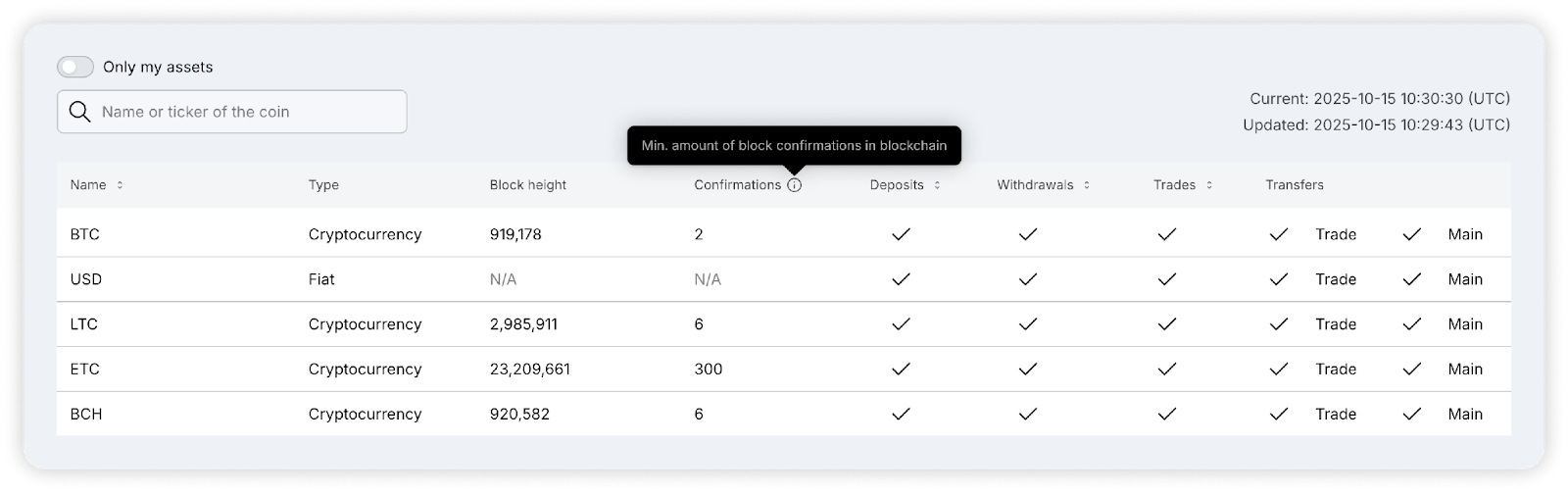 Looking at the list of currencies on the page, you can see data about the current height of the coin block in the network and the required number of confirmations for the deposit of this asset to be credited.