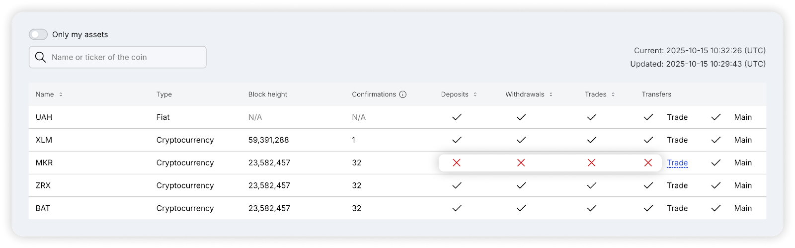 At the top of the page you can choose to filter your assets, displaying only those you have on your balance or use the search to quickly find the assets you need. You can also sort the corresponding columns for your convenience. On the right side of the screen, the current UTC time and the time of the last data update are displayed.