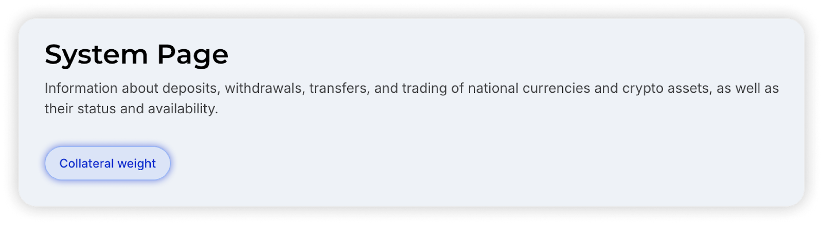 Collateral weight is a calculated weighted adjustment factor that is applied to collateral assets according to their collateral value. Each asset has its own unique margin weight.