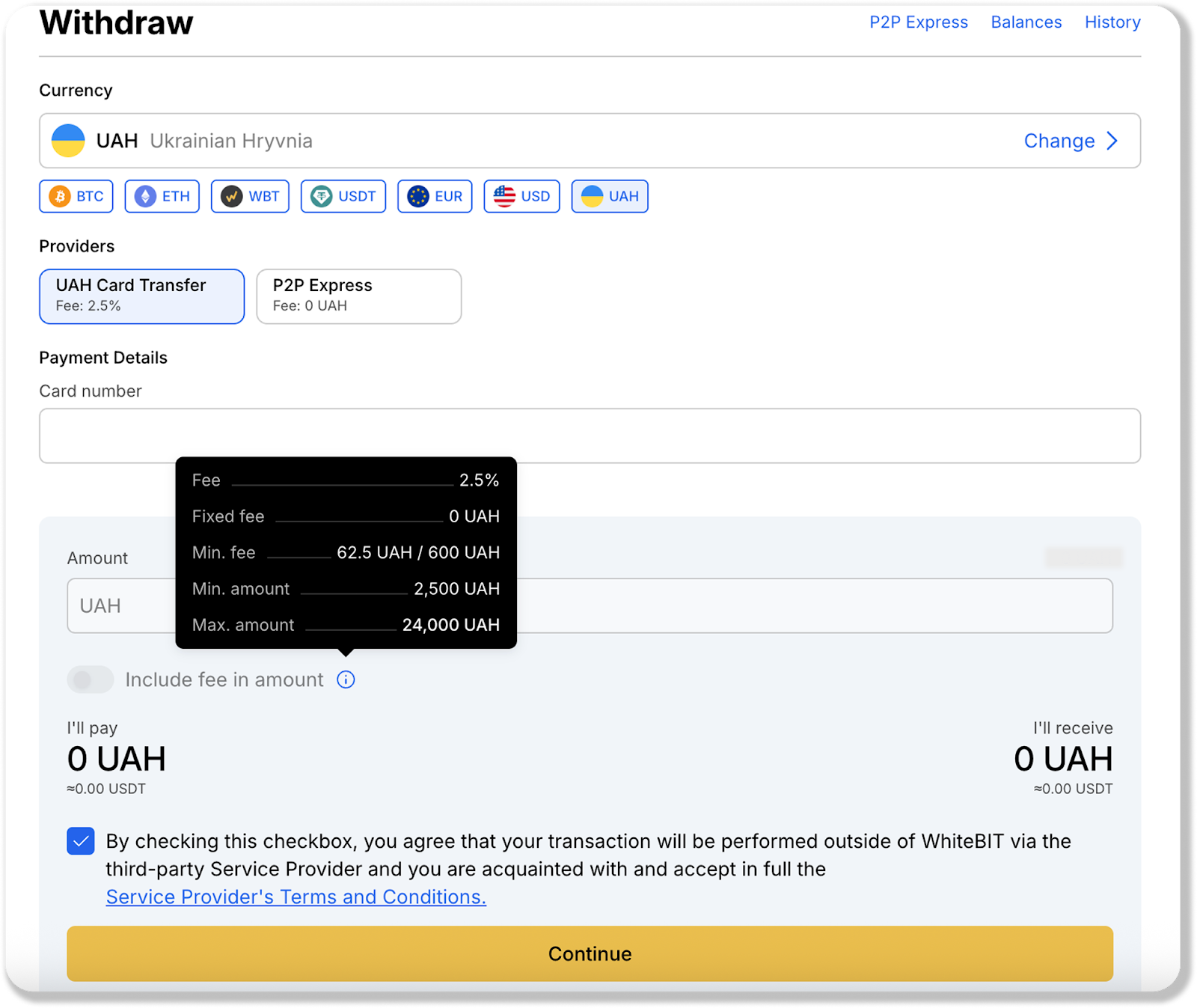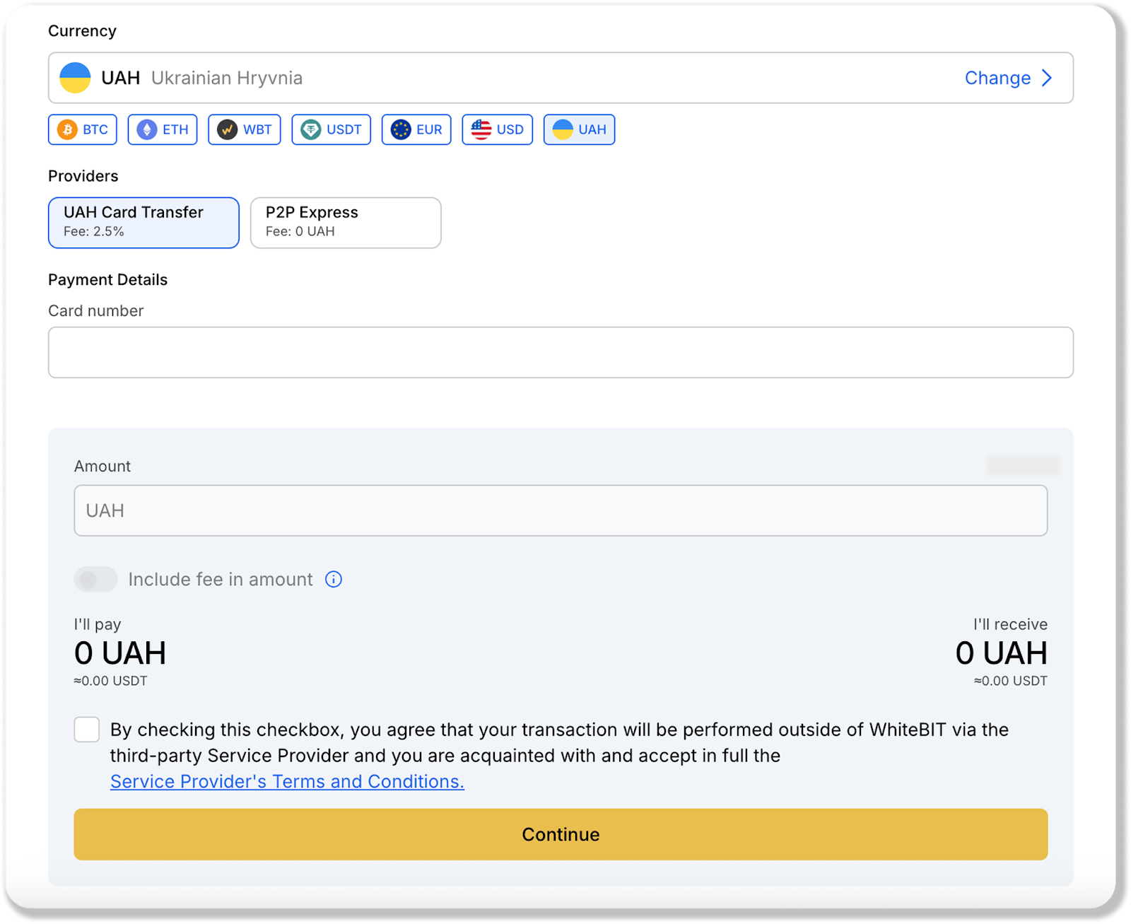 - It is necessary to read the terms of use of the service provider and tick that you agree that the transaction will be performed outside the WhiteBIT exchange by a third-party service provider, as well as confirm that you have read and fully accept the Terms of Use of the service provider.