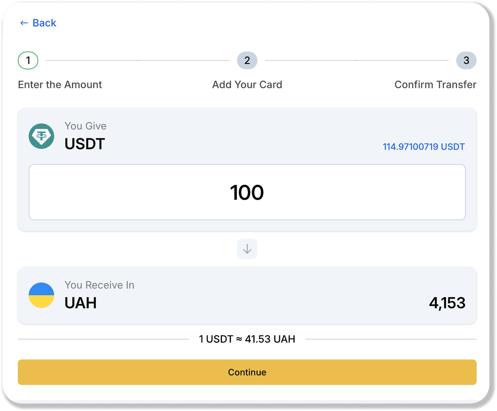 Please note: using the P2P Express function you can also exchange your UAH to USDT. For such an exchange you will need to transfer UAH to the card specified by the provider.
