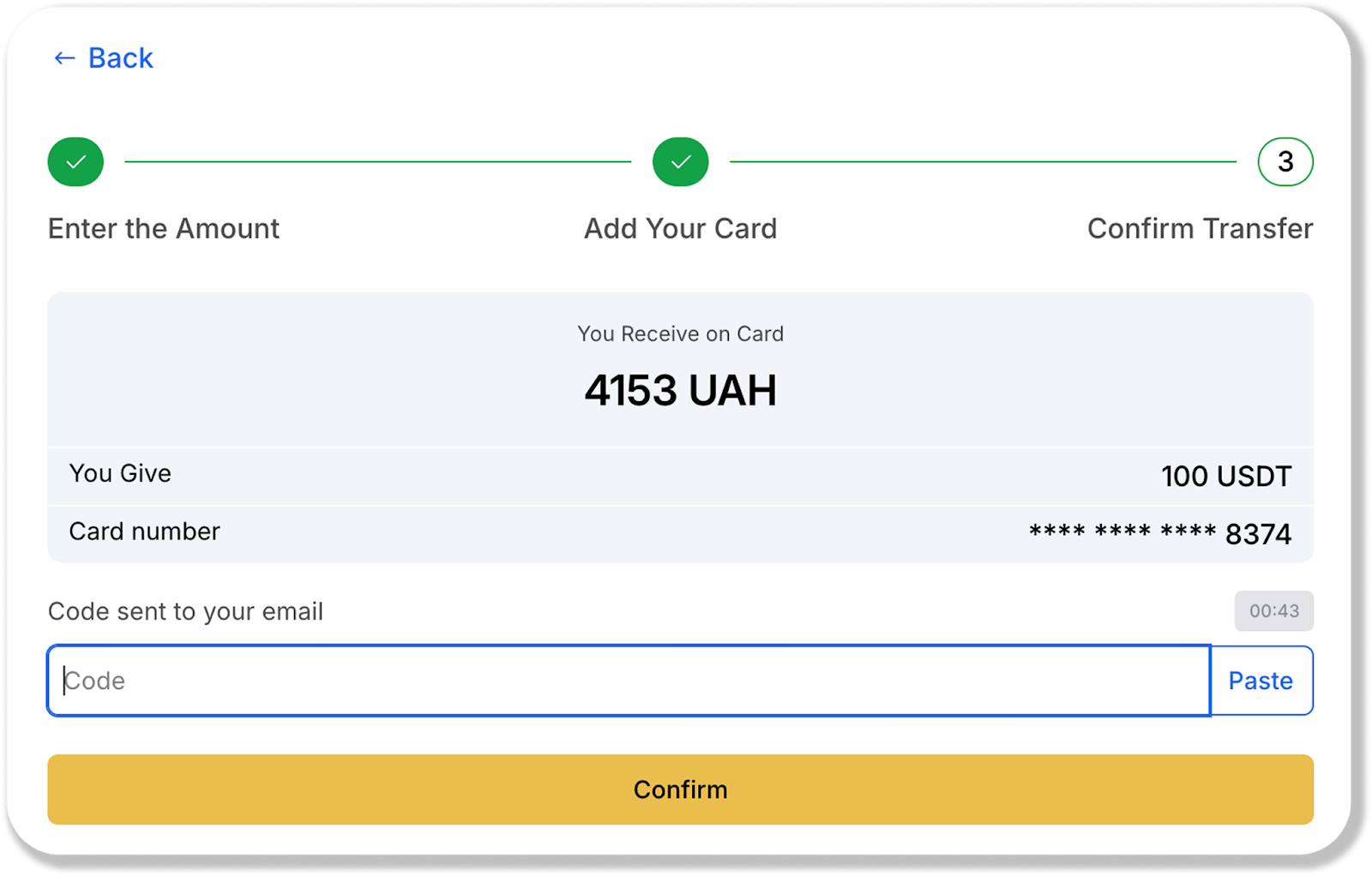 To do this you should click on the "arrows" button in the same "P2P Express" menu, then specify the exchange amount and the number of the UAH card of the Ukrainian bank, from which you will make the transfer. Afterwards, a window will open with the number of the recipient's card, to which you will need to transfer funds, and then after the transaction is processed by the service provider, USDT will be credited to your balance.