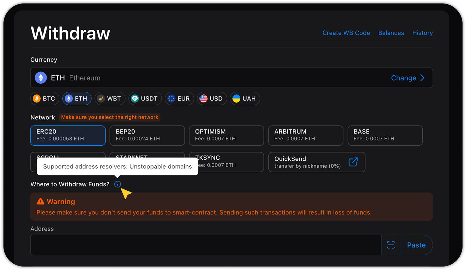 When withdrawing cryptocurrencies from WhiteBIT, you need to specify a wallet address on another platform. Thanks to Unstoppable Domains and Ethereum Name Service (ENS), the long address of your wallet can be replaced with a personalized domain. For example, WeRX17TGH1gqRM21h2G3Itf4Ao08Q can be replaced with [YourName].crypto.