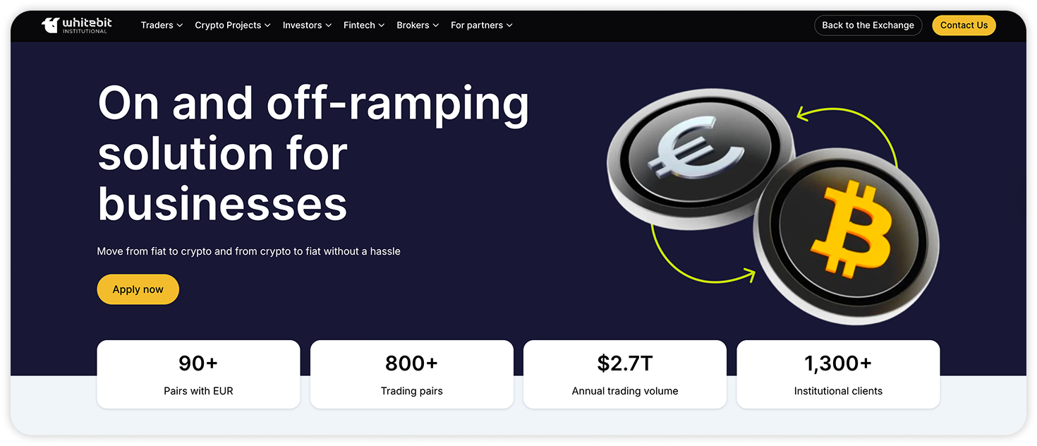 WhiteBIT provides comprehensive business solutions that allow companies to quickly, securely, and conveniently perform both On-Ramp and Off-Ramp operations through SEPA transfers.