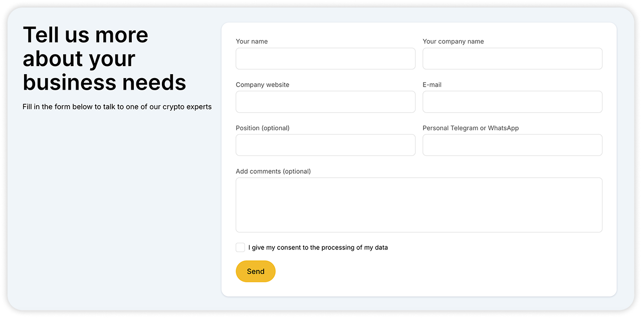 - Submit an application on the WhiteBIT for Business website (Payments for Businesses page).