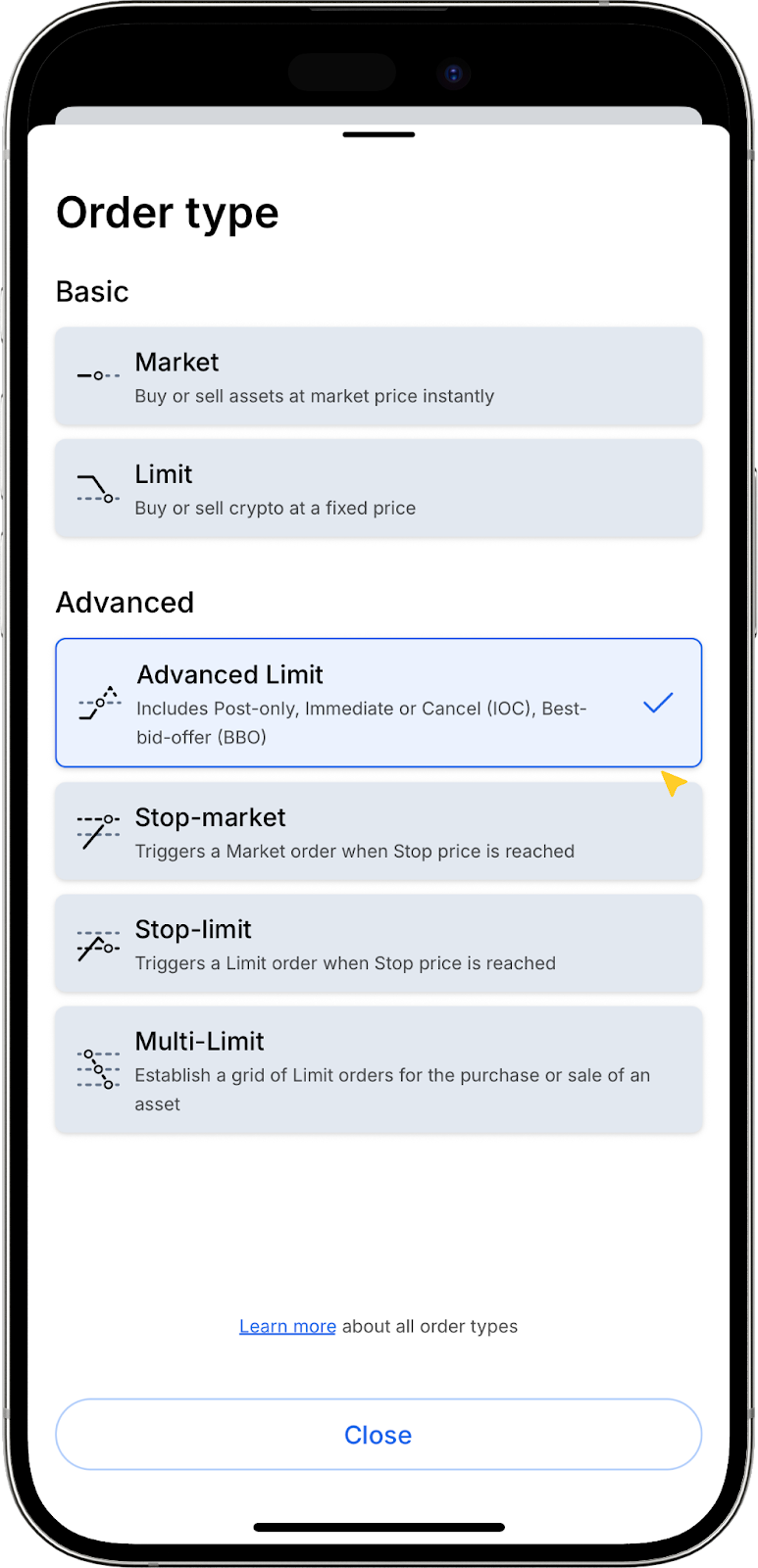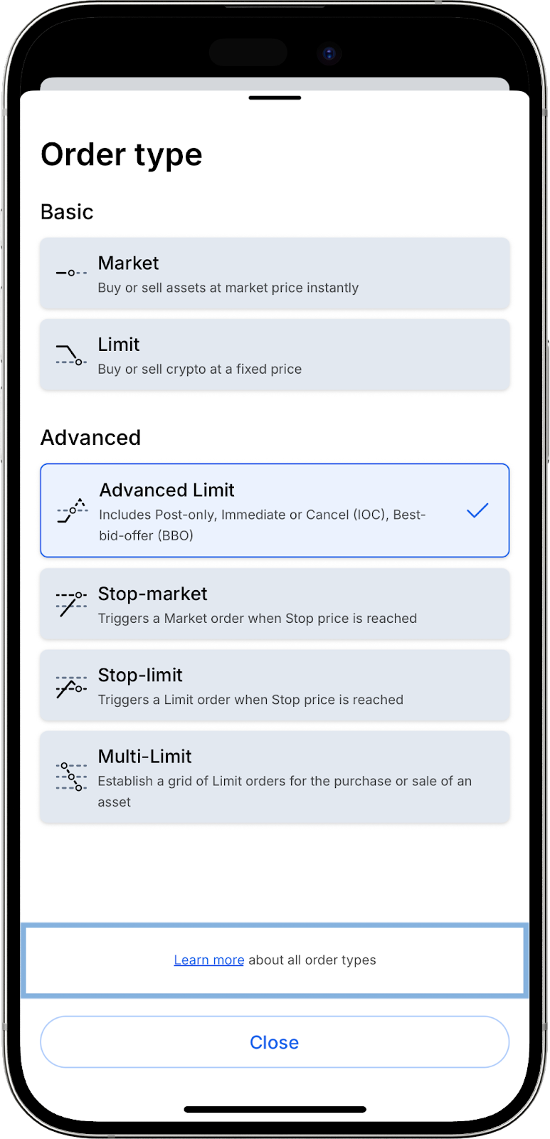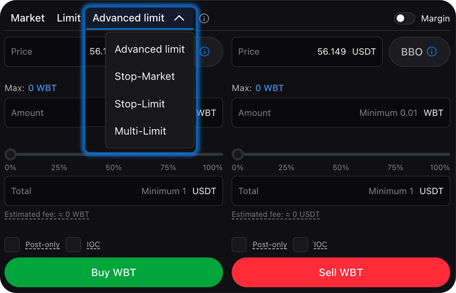 - Advanced Limit (a Limit Order with additional execution conditions: Post-only, BBO, or IOC)