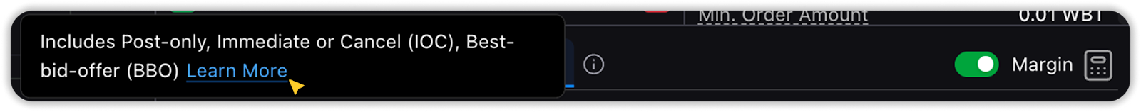 - Advanced Limit Order (includes additional execution options: Post-only prevents taker fees, BBO improves queue position, IOC cancels unfilled portions immediately)