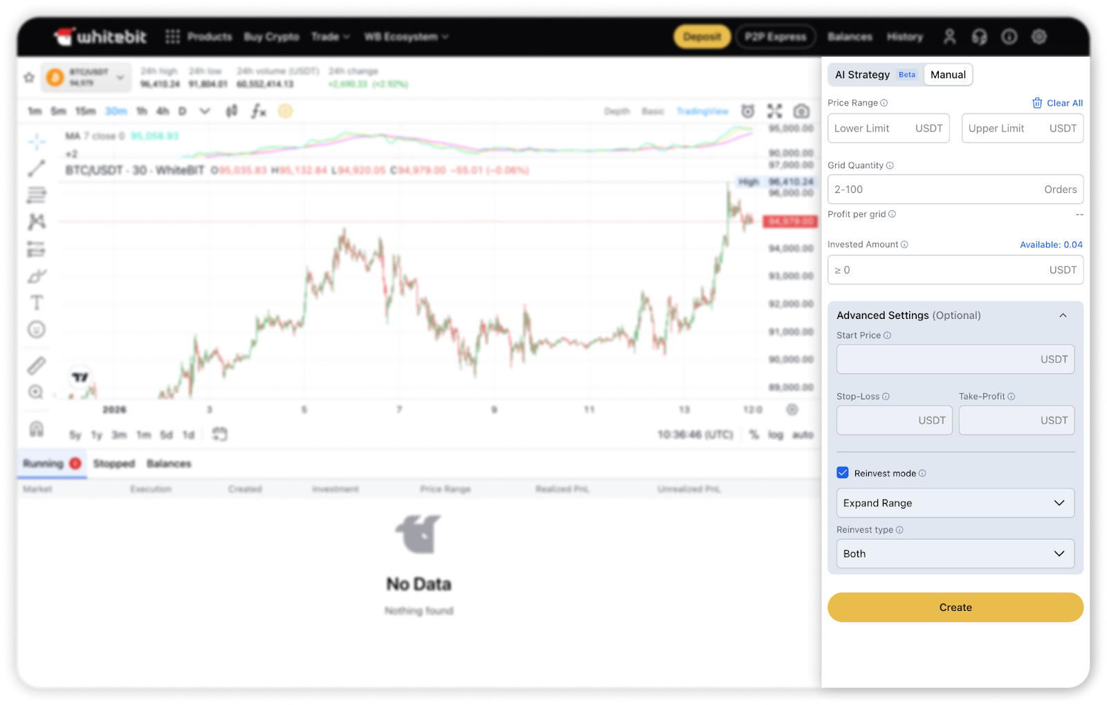 Flexible Investment Options: When setting up the bot, you can specify exactly how much to invest. The interface will show the minimum required amount for your chosen settings and how much of your balance is available, helping you adjust the investment accordingly. Before launching the bot, you’ll see a clear preview of all the bot’s parameters and an estimated performance (in AI mode) so you know what to expect. If your balance is insufficient, a convenient deposit link is provided so you can top up funds without leaving the setup page. This ensures that you deploy the bot with the right amount of capital for the strategy.
