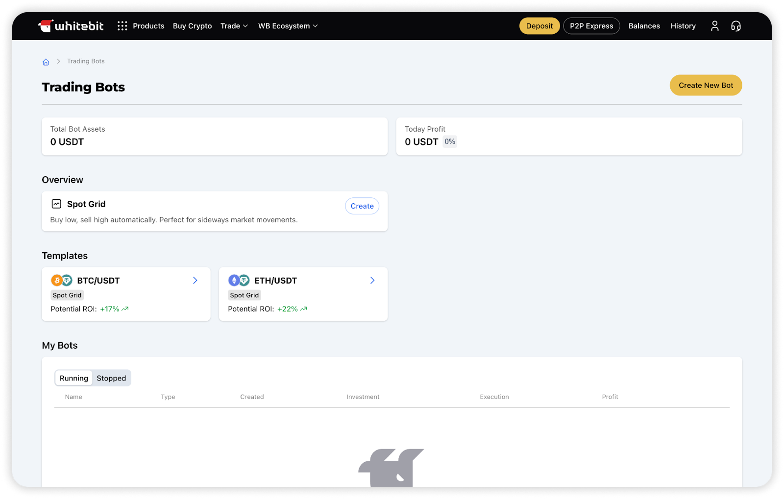 The Spot Grid Trading Bot on WhiteBIT is an automated trading tool that helps you profit from market volatility with minimal effort. It works by placing a grid of buy and sell orders at preset price intervals within a defined range, effectively buying low and selling high as the market oscillates. This strategy is ideal for sideways or range-bound markets – the bot continuously executes small trades to capitalize on every price fluctuation.