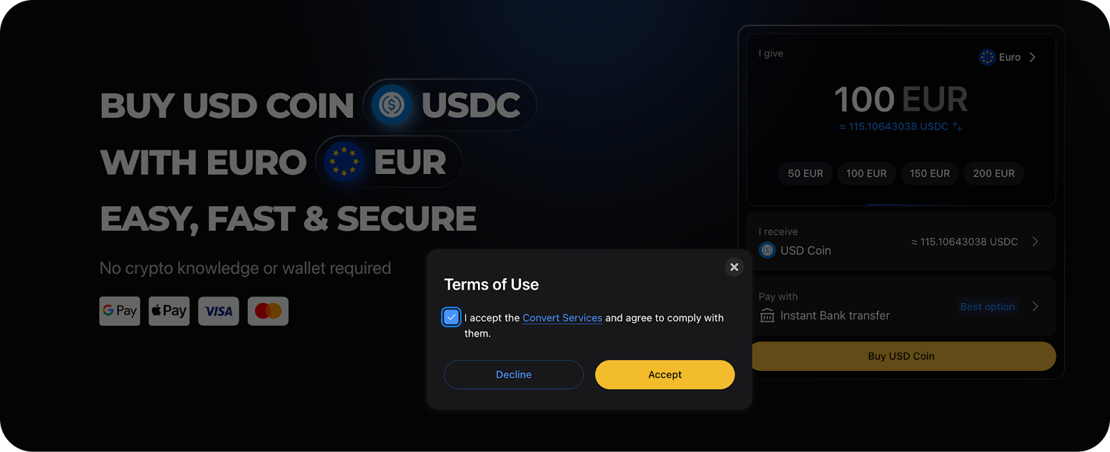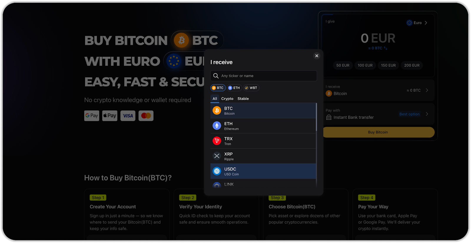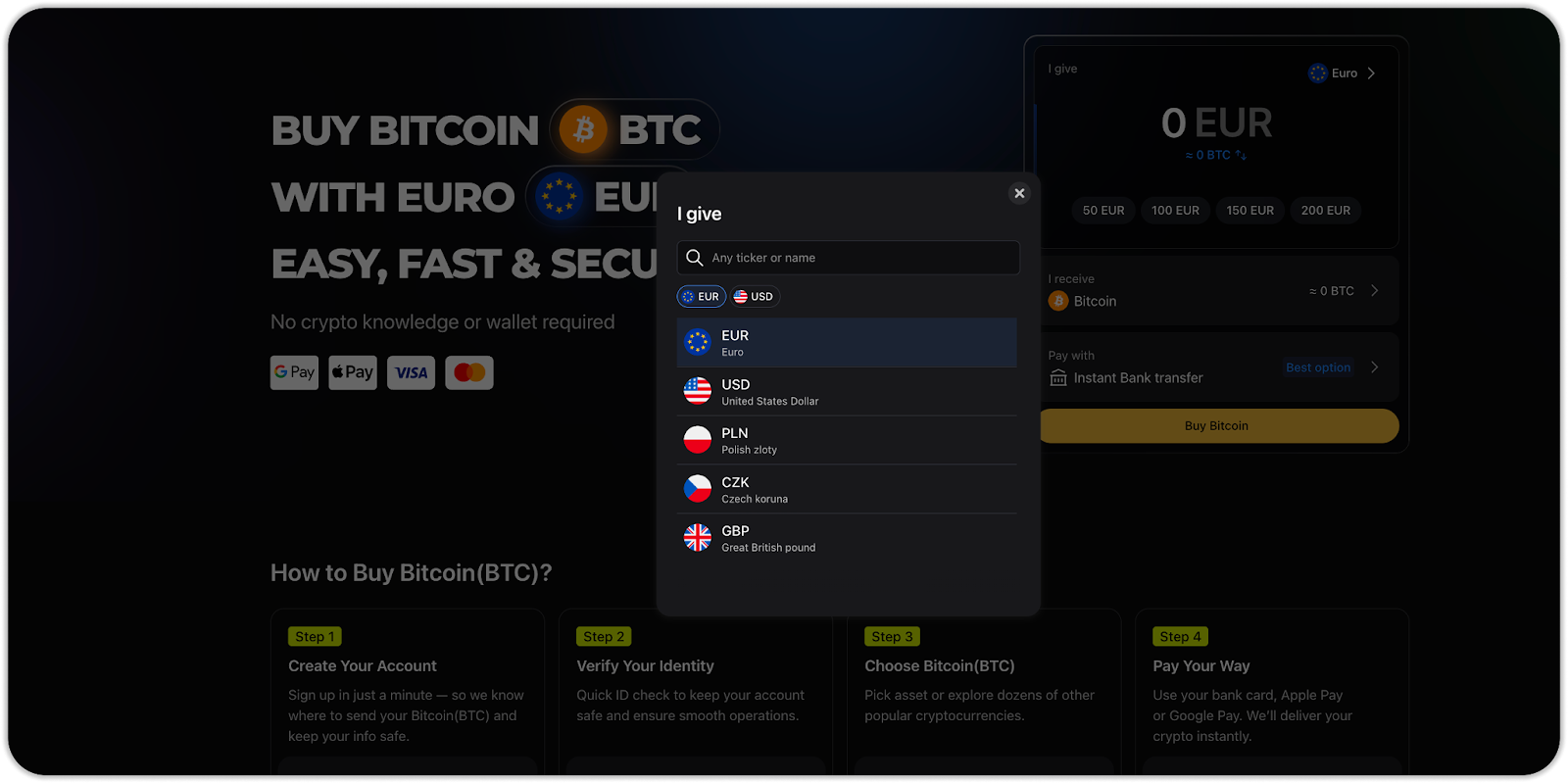 - Select the fiat currency (EUR, USD, PLN, CZK, GBP) you want to use for payment and the cryptocurrency you want to receive to your wallet.