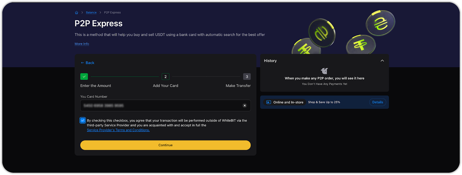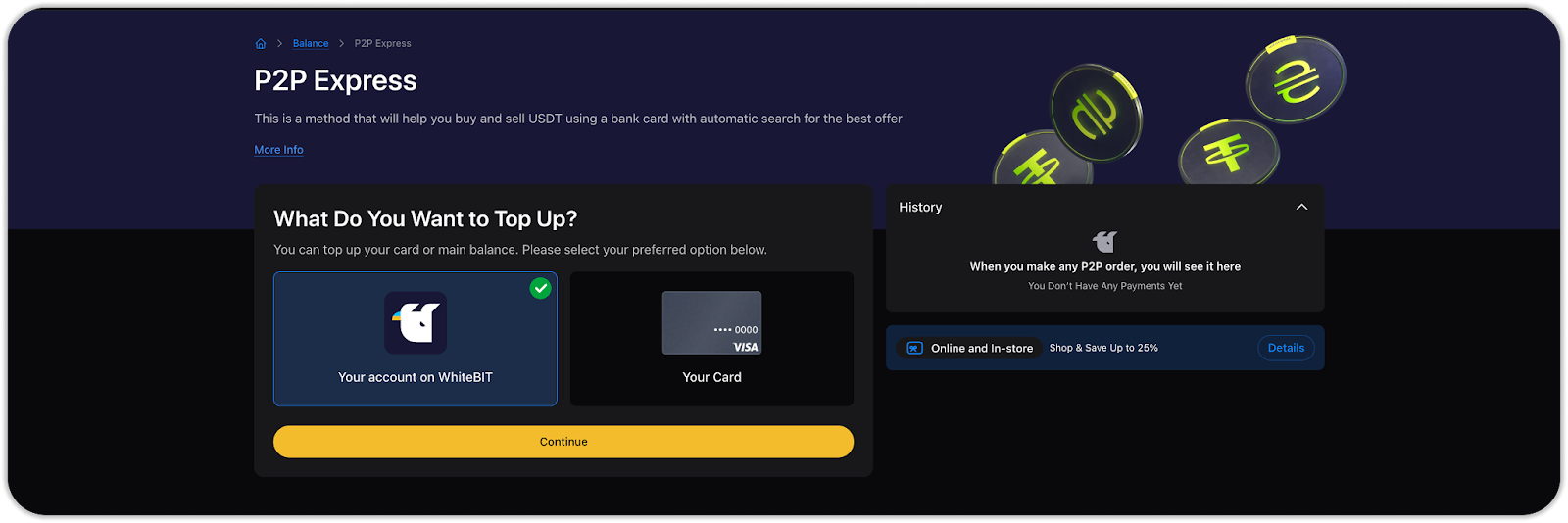 P2P Express is a feature that allows you to exchange USDT ↔ UAH, either funding your exchange balance or receiving funds to a bank card. The exchange is carried out via a third-party P2P service that automatically selects a suitable offer. Below is a short guide: