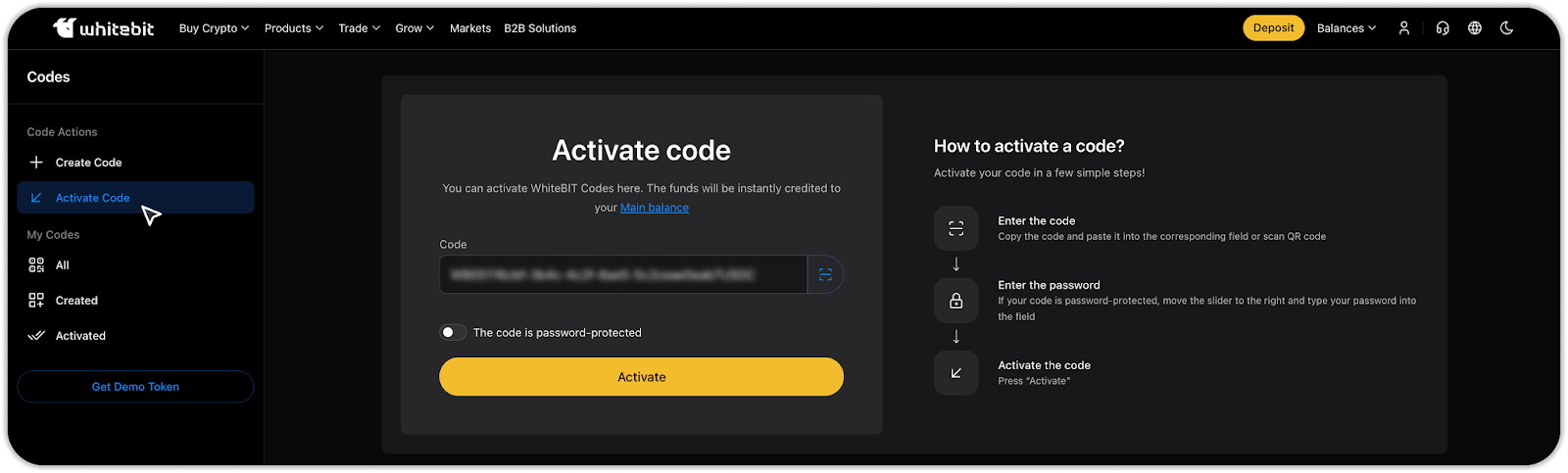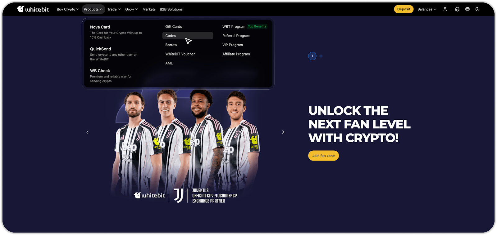 - Go to “Products” — “Codes” in the web version, or “WhiteBIT Products” — “Finance” and tap “Codes” in the mobile app.