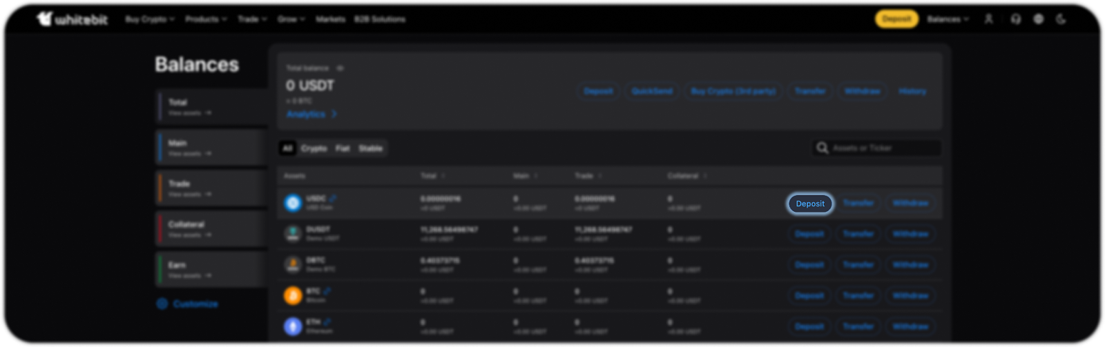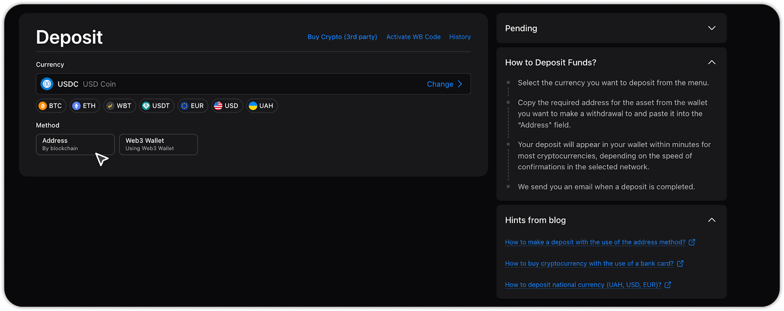 Funding your balance is the first step to accessing the full functionality of WhiteBIT. We offer several deposit methods — from classic deposits to internal tools for fast transfers. This article gathers all available funding methods so you can choose the most convenient one.