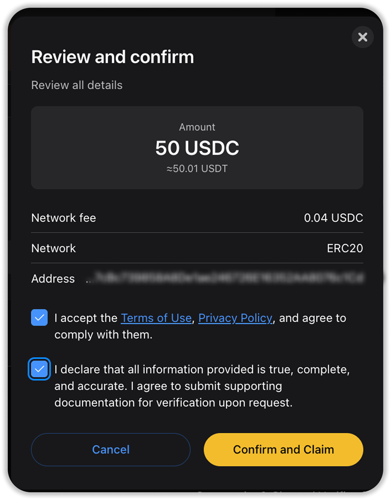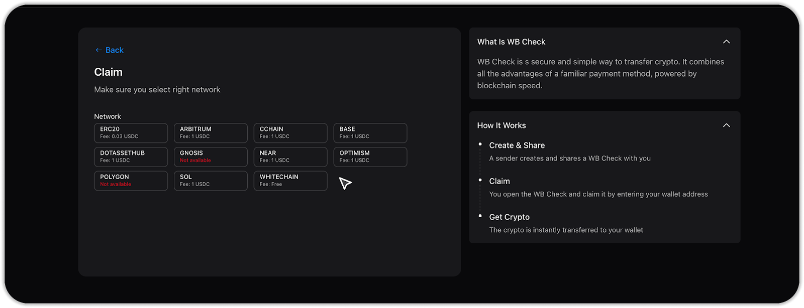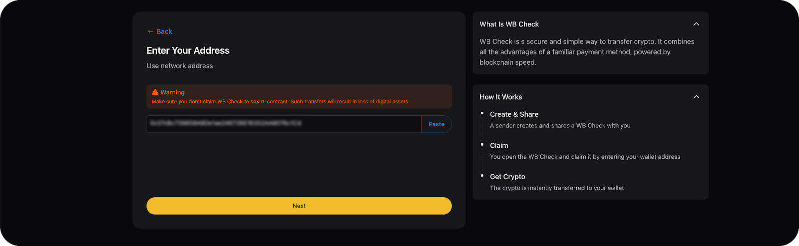 Please note: you can only receive the same cryptocurrency that was sent. The network fee is deducted from the check amount.
