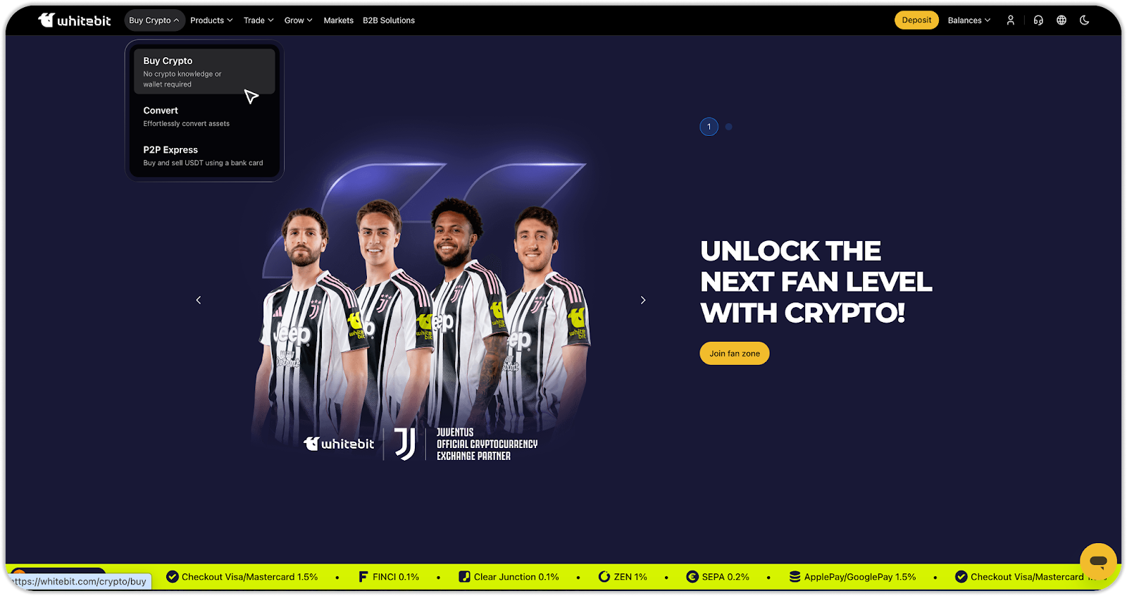 - Go to the “Buy Crypto” section on the top-left side of the website, or navigate to “WhiteBIT Products” — “Finance” or “Buy” in the mobile app.