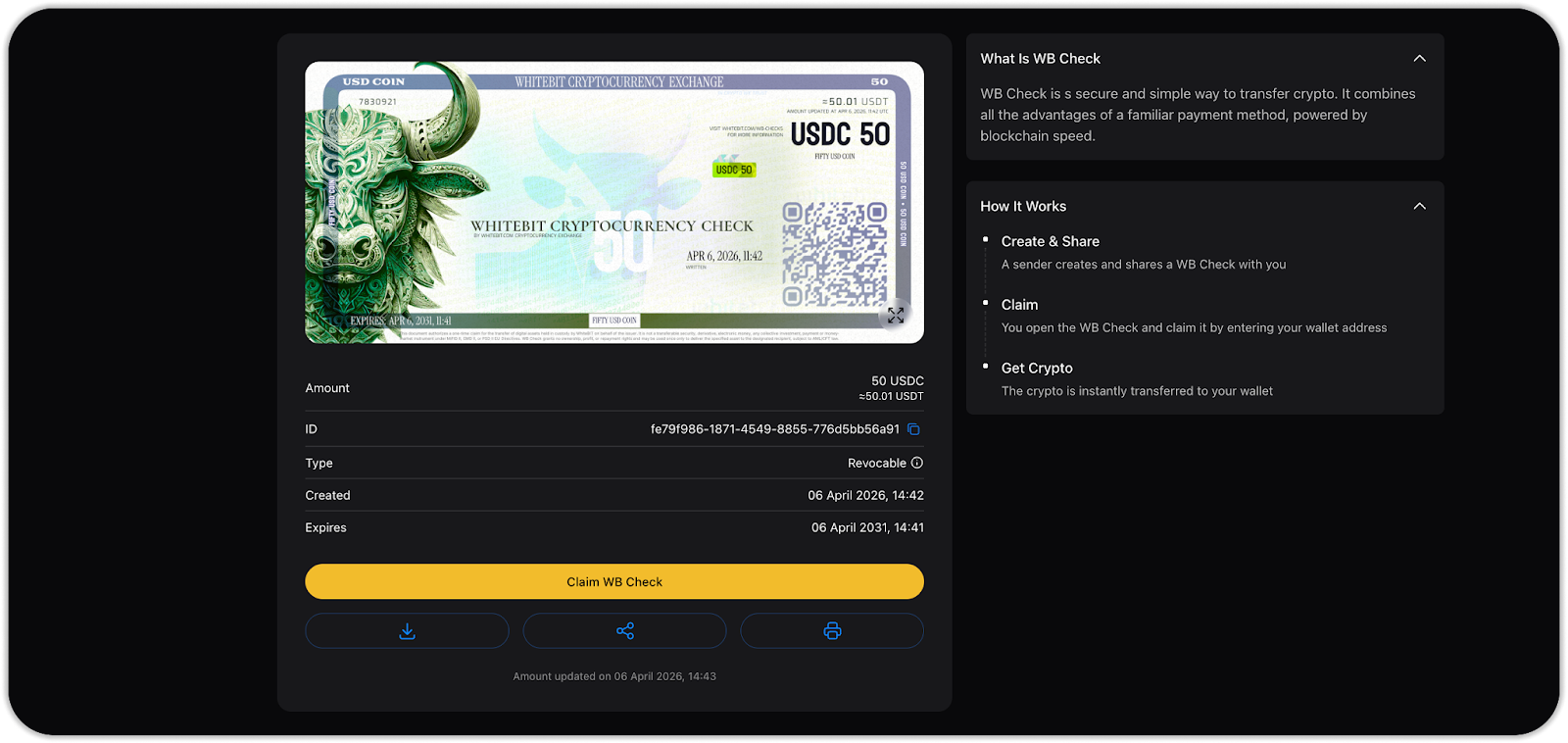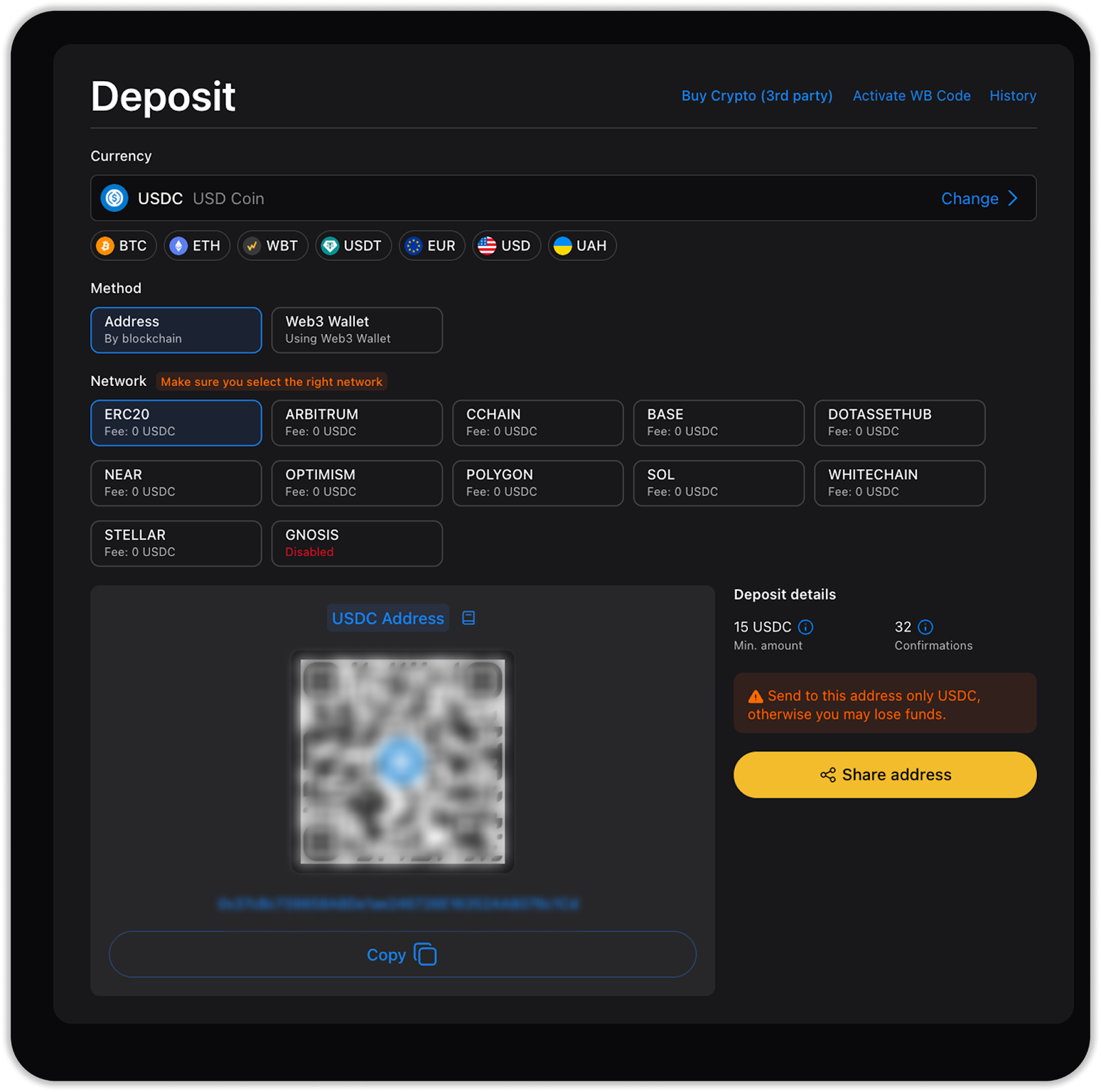- WhiteBIT code (crypto transfers between WhiteBIT accounts);